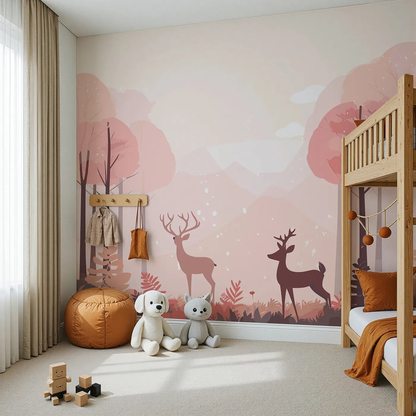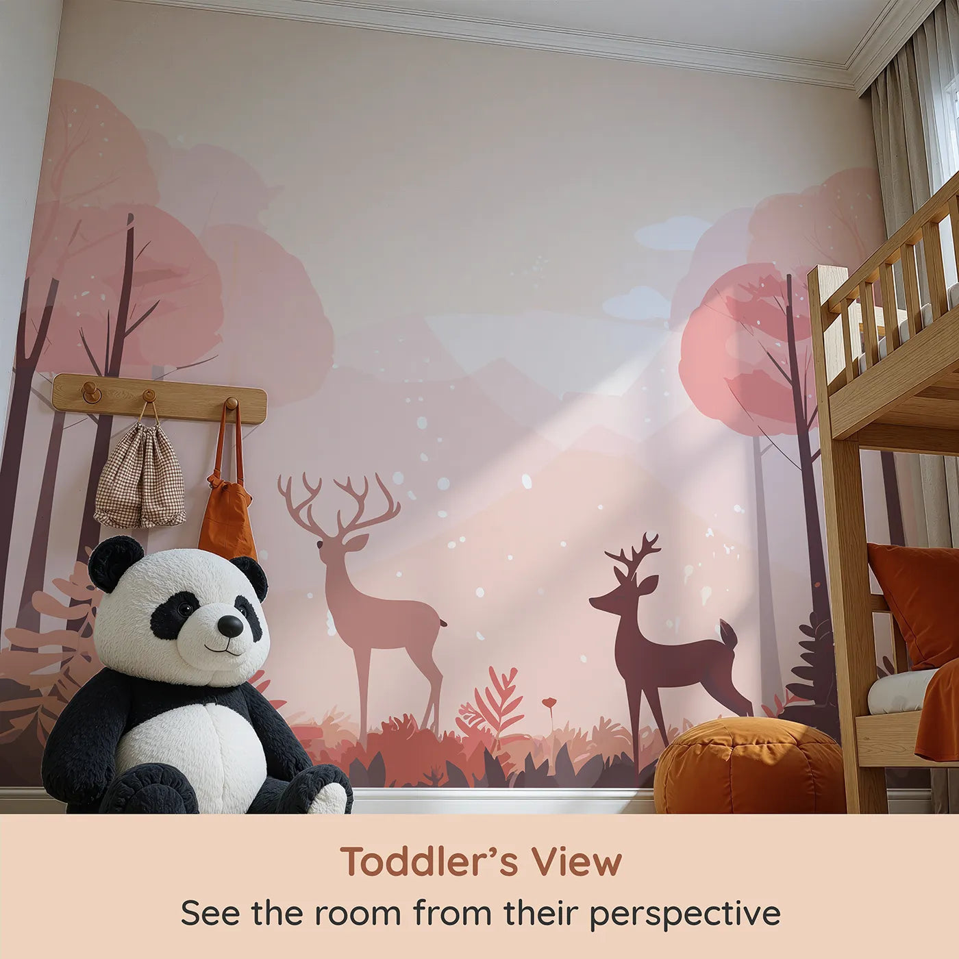 Set a scene of gentle wonder with our pink autumn forest wall mural. This enchanting scenic wallpaper features a beautiful forest with a soft, misty quality, all in stunning shades of pastel and blush pink. It creates a uniquely warm, cozy, and imaginative atmosphere.
