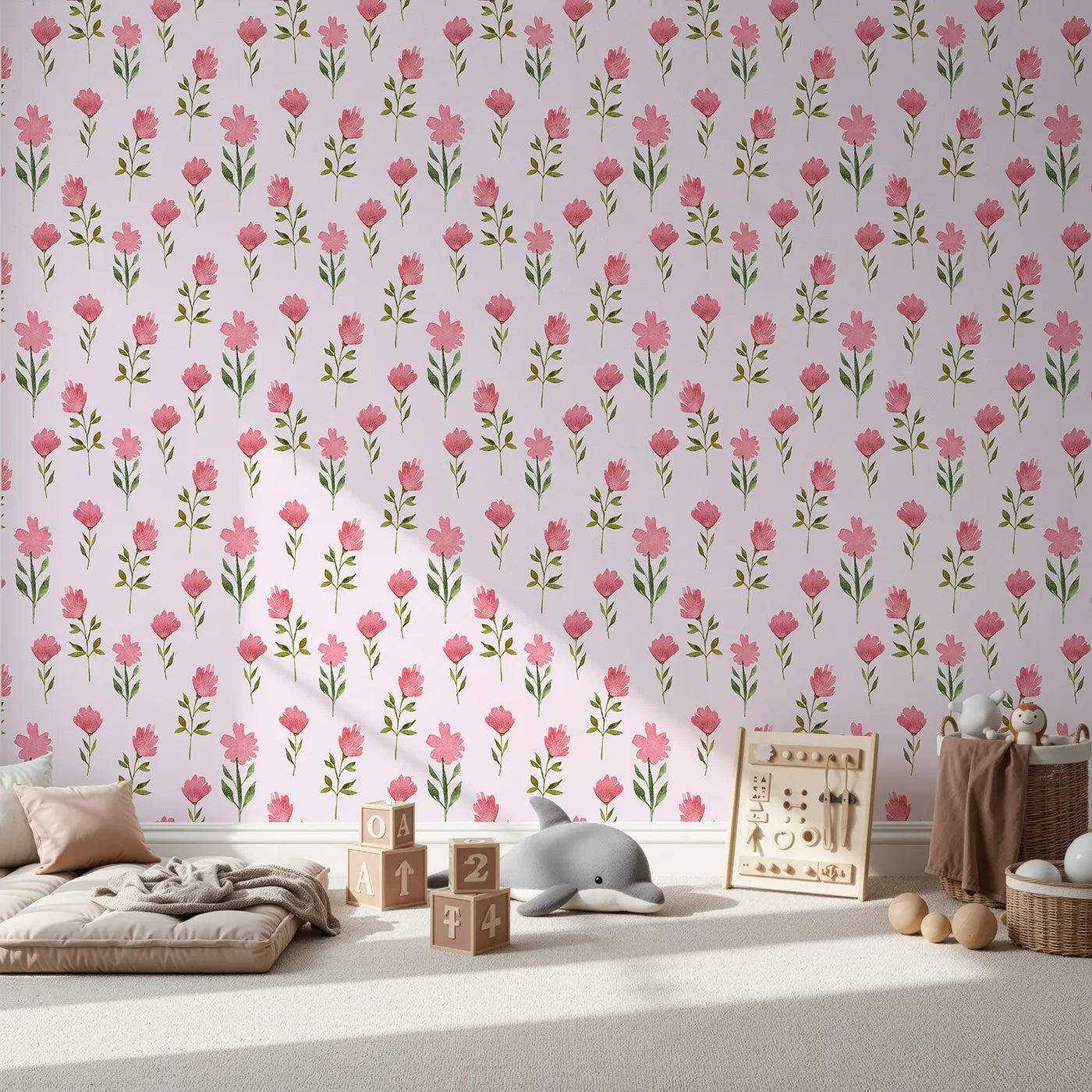 This charming floral wallpaper features a sweet pattern of simple pink blossoms and leaves scattered across a blush pink background. The delicate, hand-painted watercolor style brings a fresh and cheerful feel to any room, perfect for a bright nursery or a sweet playroom for your little one.