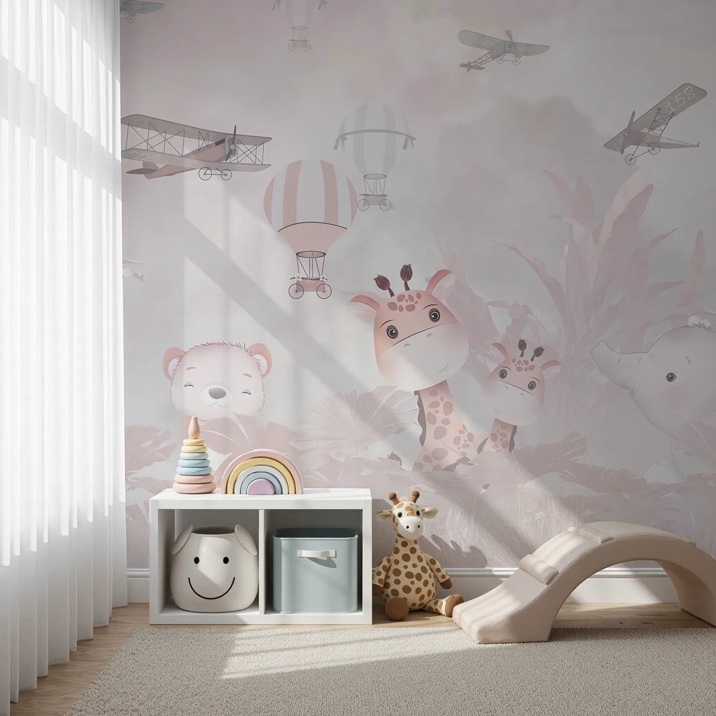 This beautiful and sophisticated safari wall mural features a collection of cute animals, including an elephant and giraffe, in a lush, tropical setting with vintage airplanes and hot air balloons. The soft pink sky gives it a chic and calming atmosphere, perfect for a modern nursery or a stylish little girl's room.