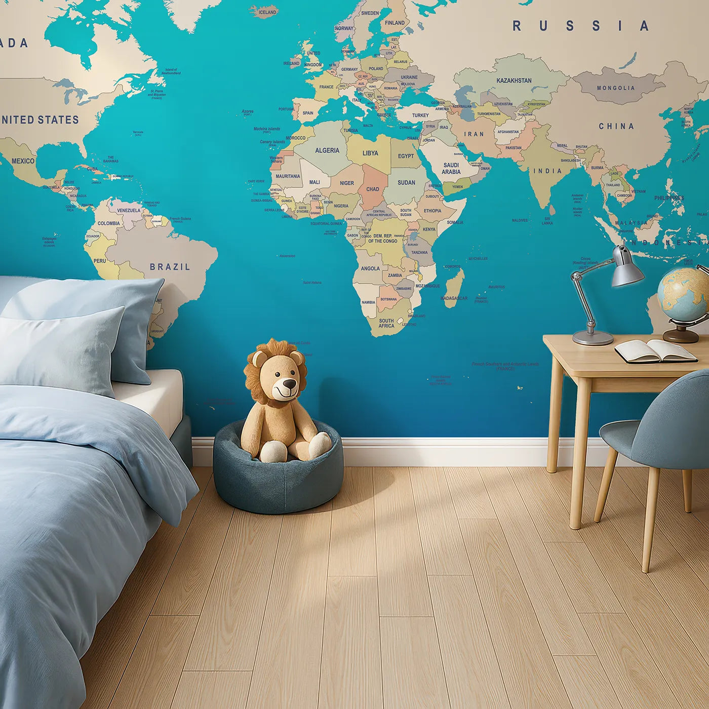 This charming world map wall mural is a fun and educational centerpiece for any curious child's room. Each country is clearly labeled and colored, making it easy to distinguish different nations and learn about geography. The bright, ocean blue makes the continents pop.