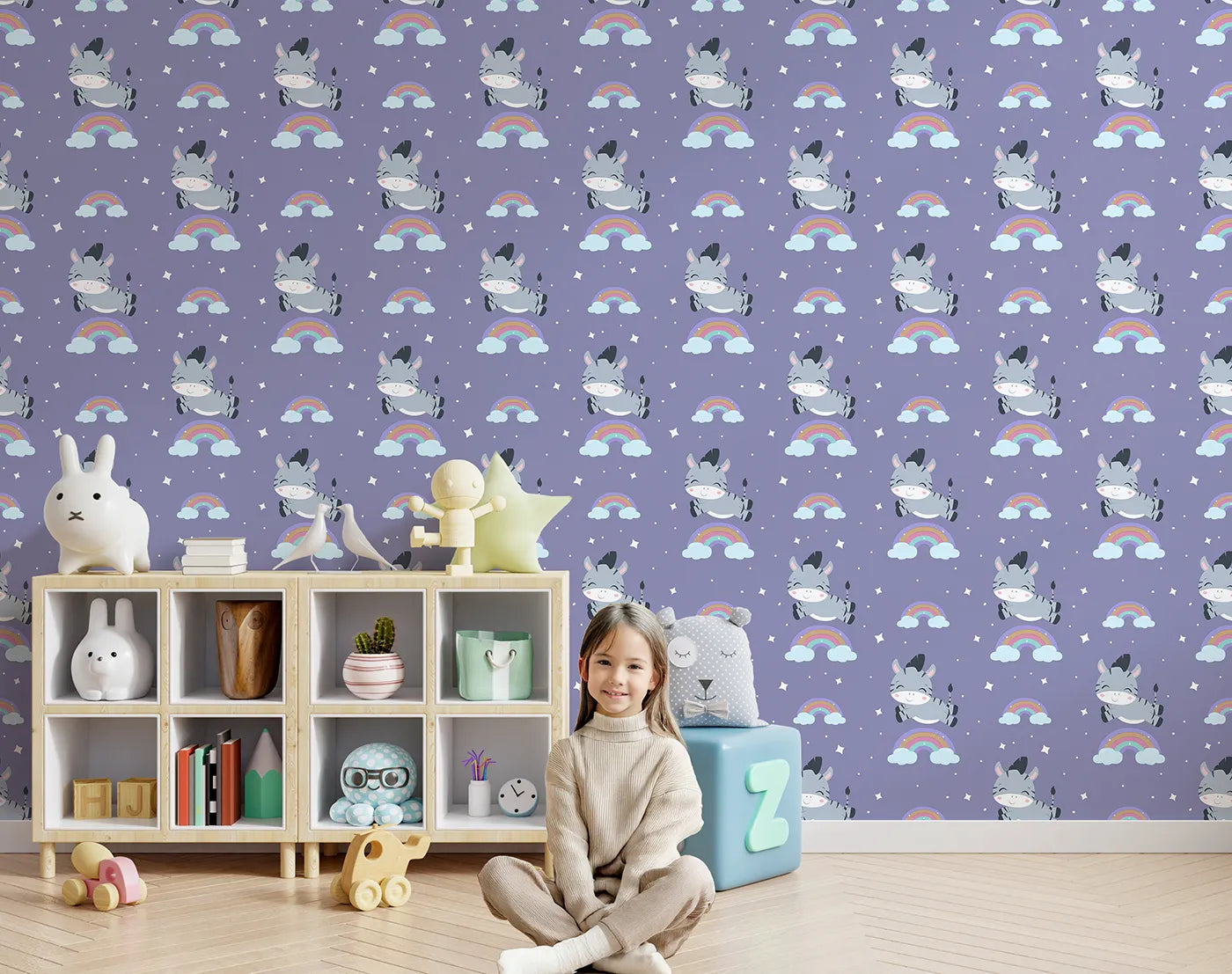 This whimsical kids wallpaper features happy zebras leaping over pastel rainbows against a dreamy purple sky filled with stars. The magical and imaginative scene is perfect for creating a room that inspires fairy tales, creative play, and the sweetest of dreams.