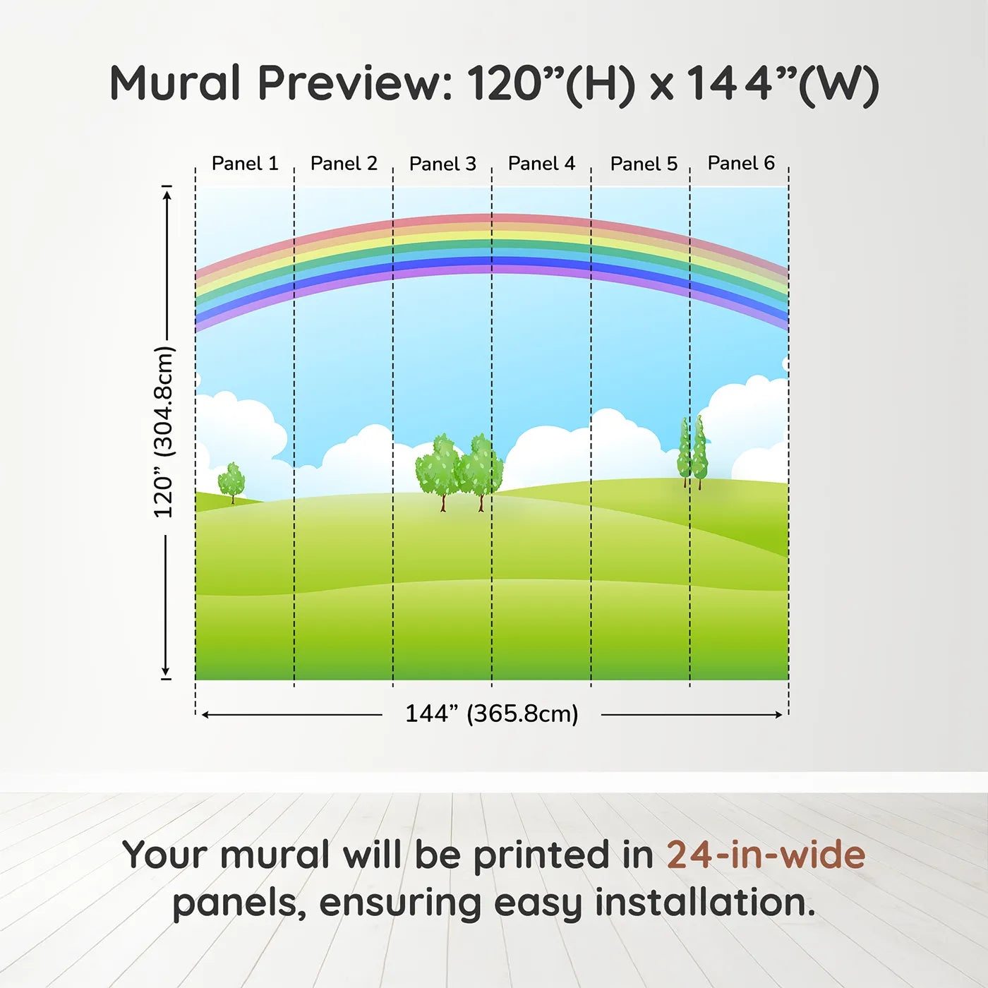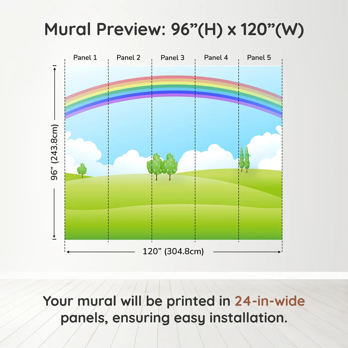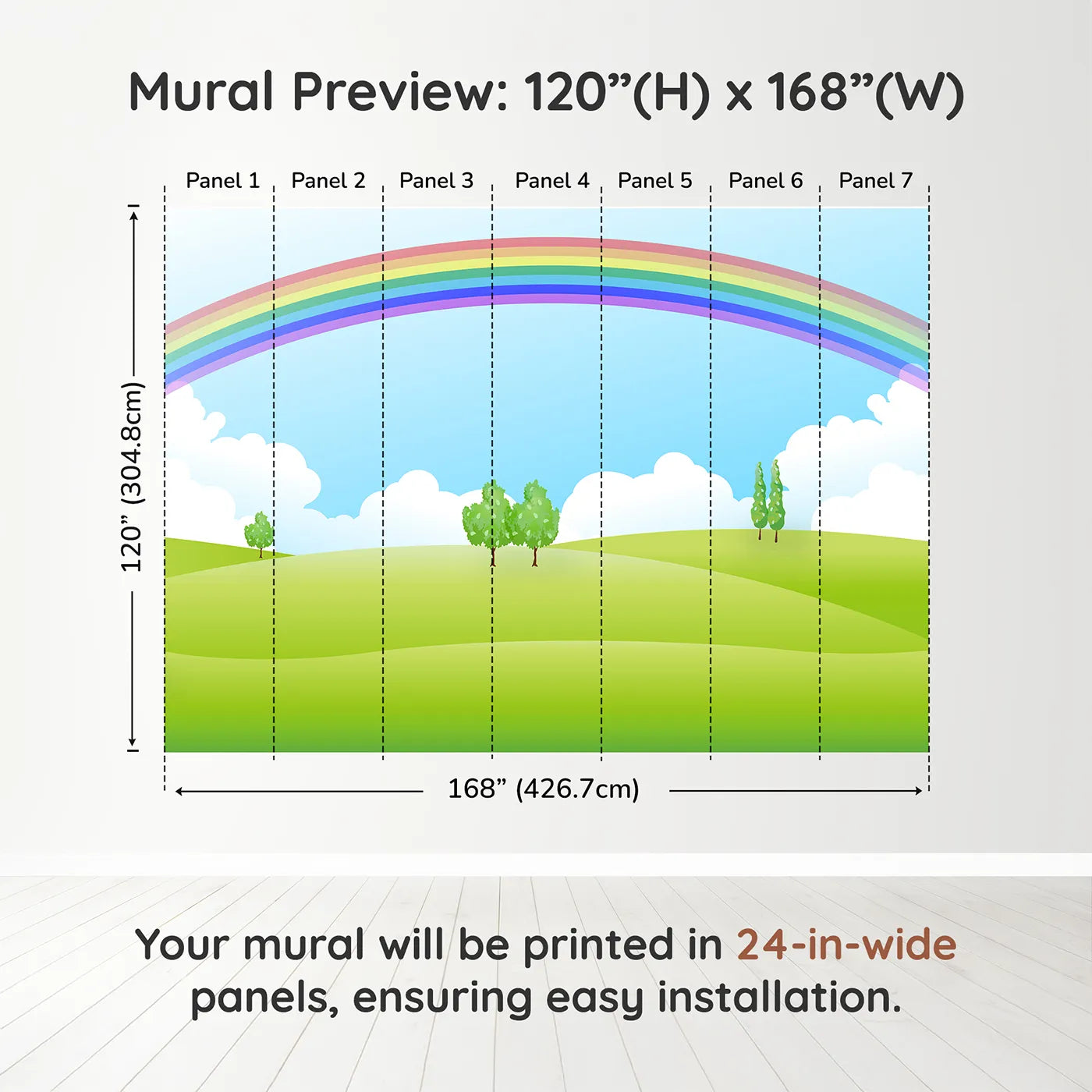 This beautiful wall mural features a simple, vibrant landscape of rolling green hills under a bright blue sky. A big, colorful rainbow stretches across the scene, creating a joyful and energetic atmosphere perfect for a child's room or playroom.