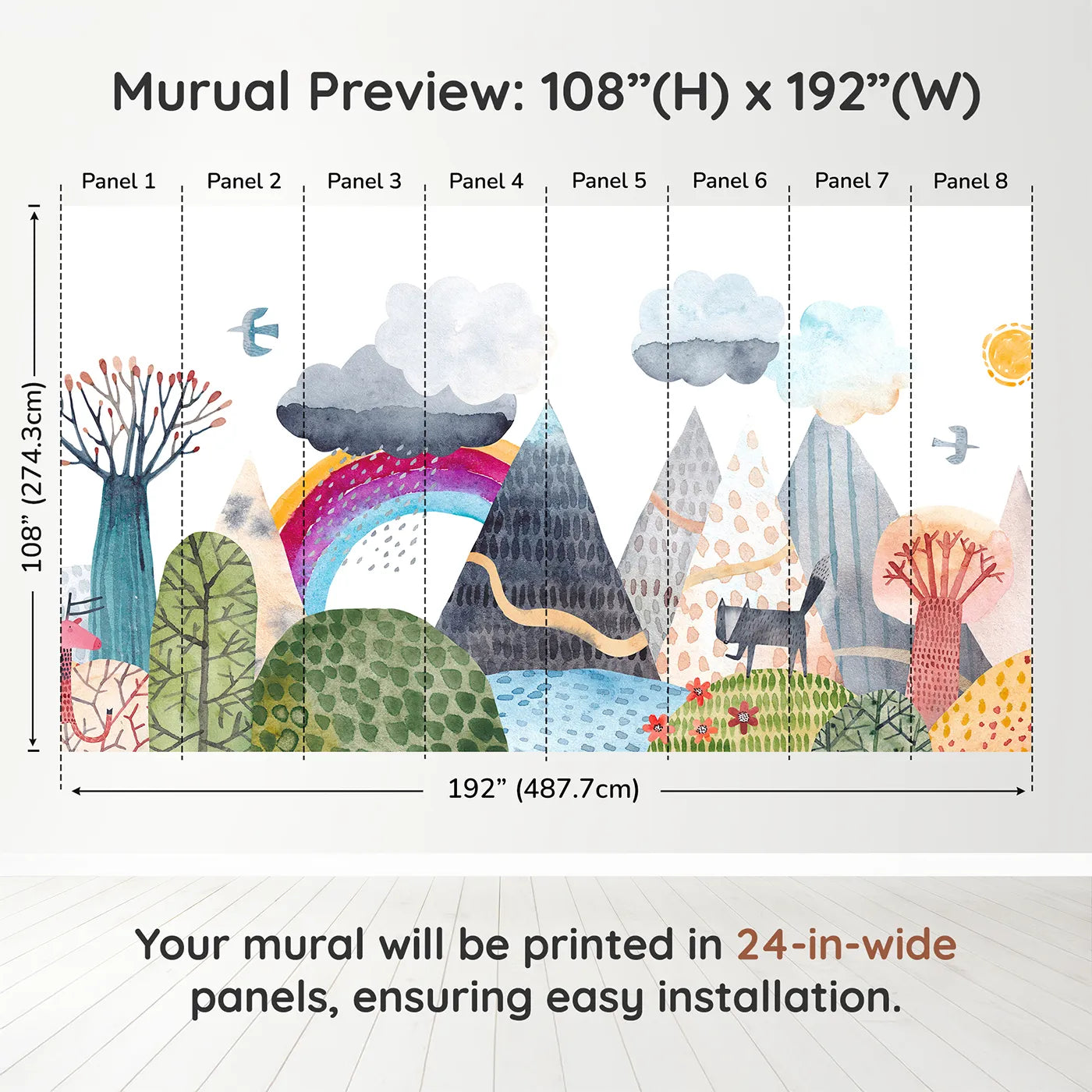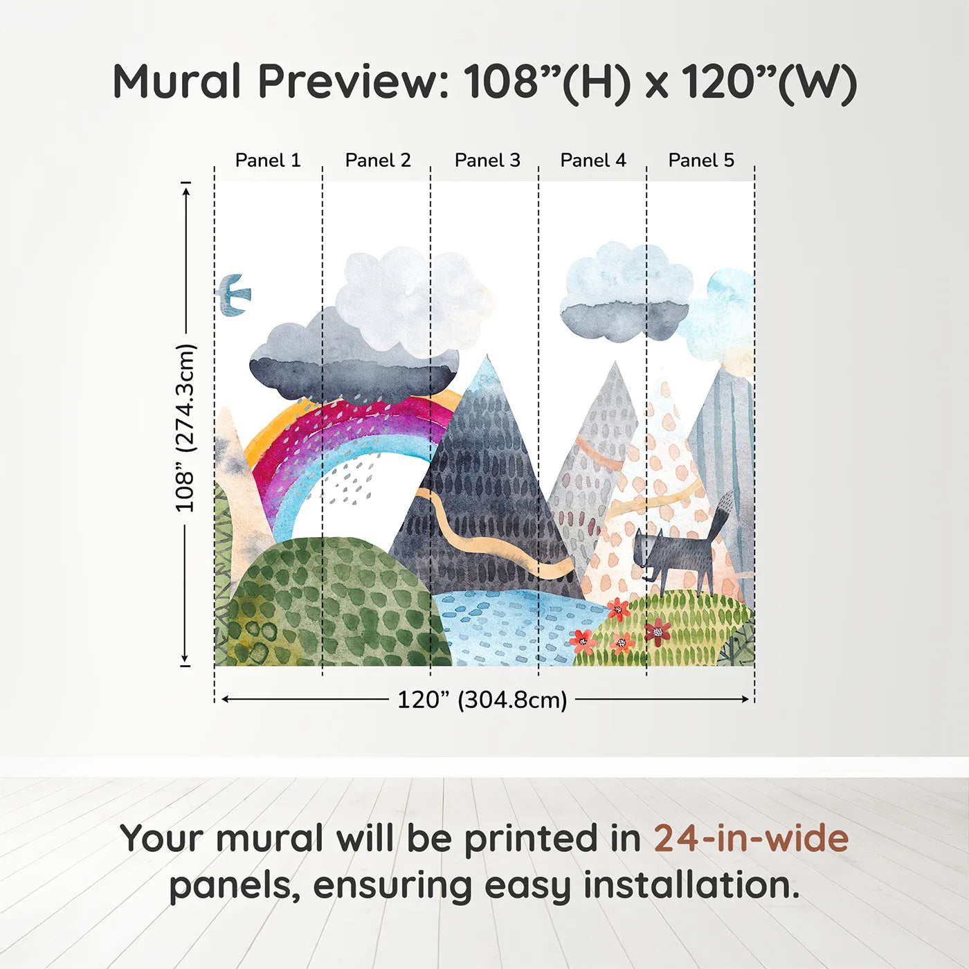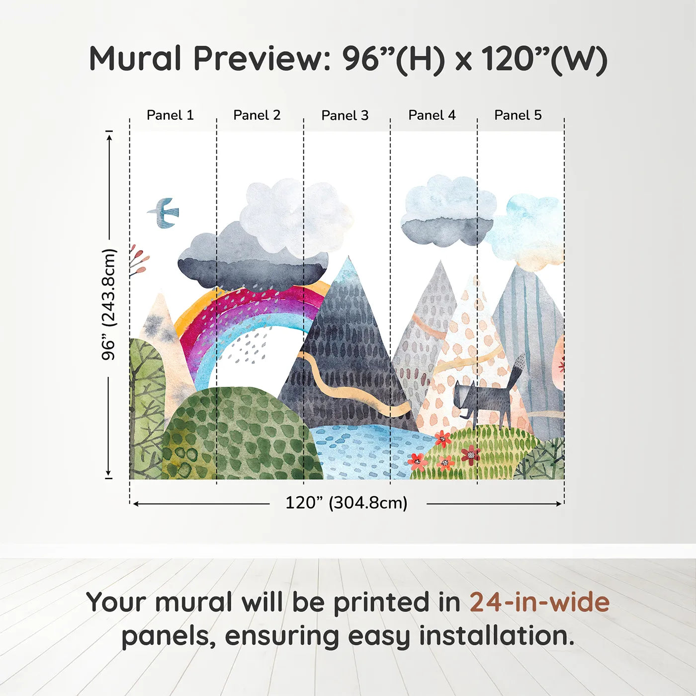 This enchanting wall mural features a whimsical, watercolor landscape of colorful, textured mountains. A gentle rainbow arcs over the scene as a friendly wolf wanders through the forest, creating a magical and peaceful world. The artistic, storybook style is perfect for an imaginative child's room.