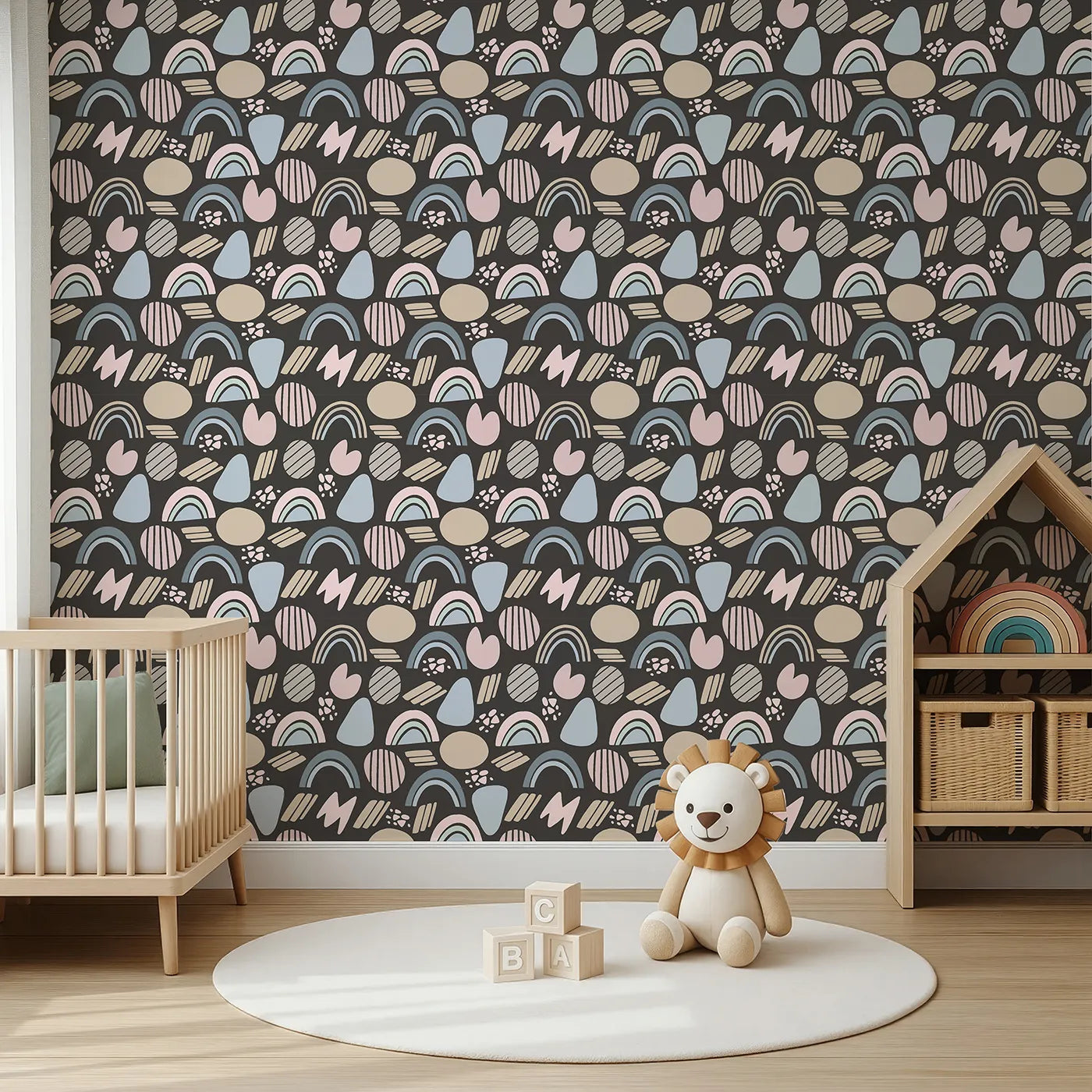 This charming rainbow wallpaper sets a scene of gentle wonder. The modern charcoal gray background offers a chic yet playful foundation, making the soft colors of the rainbows and abstract shapes stand out beautifully. It's a sophisticated design for a stylish nursery or playroom.