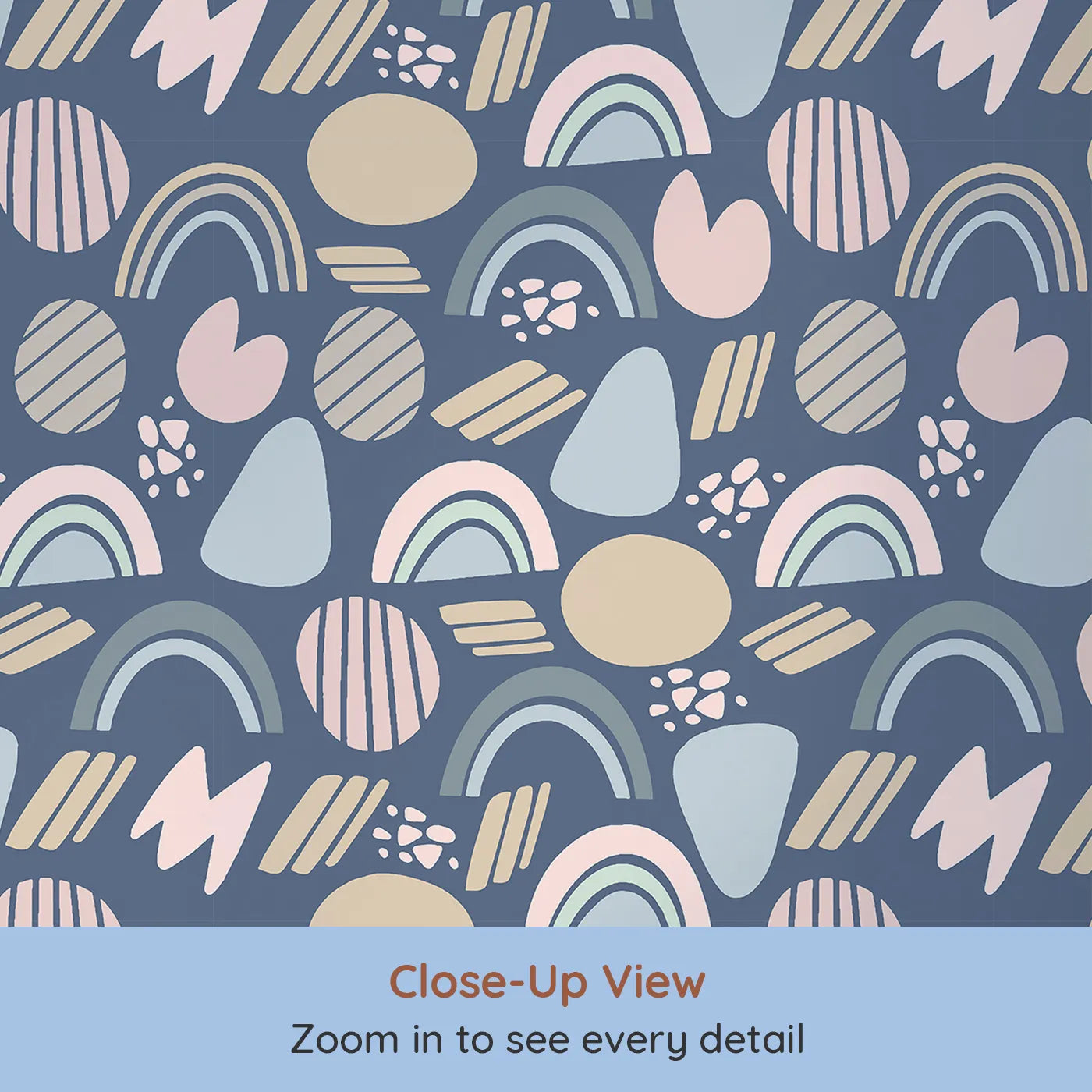 This charming rainbow wallpaper sets a scene of gentle wonder. The dreamy midnight blue background feels like a soft night sky, allowing the pastel rainbows and abstract shapes to glow. It is a magical, modern design perfect for inspiring sweet dreams in any nursery or playroom.