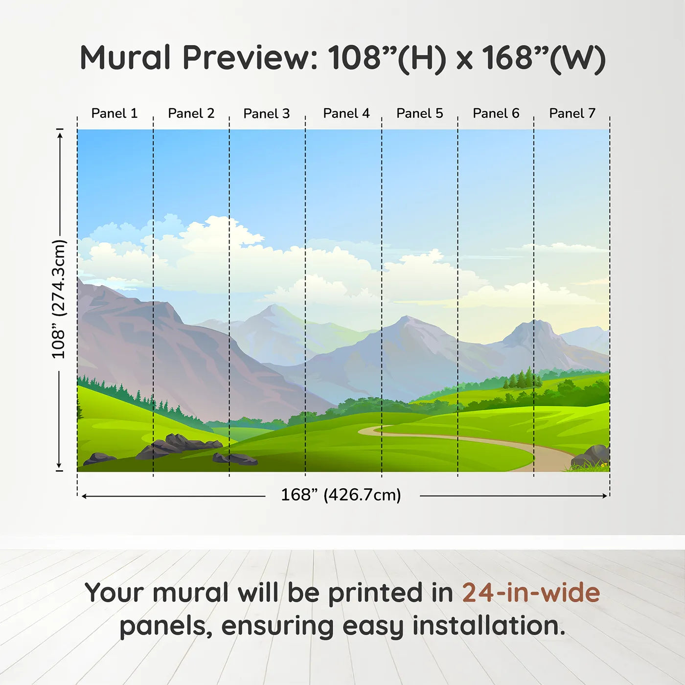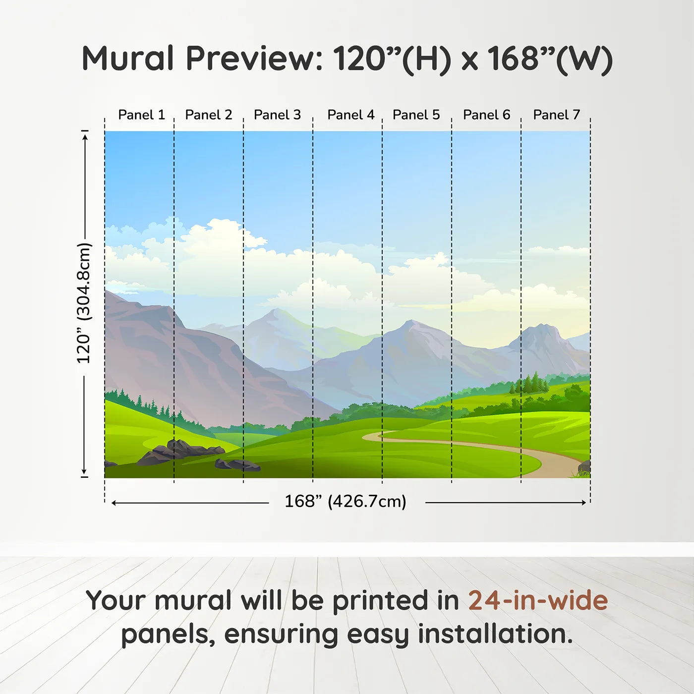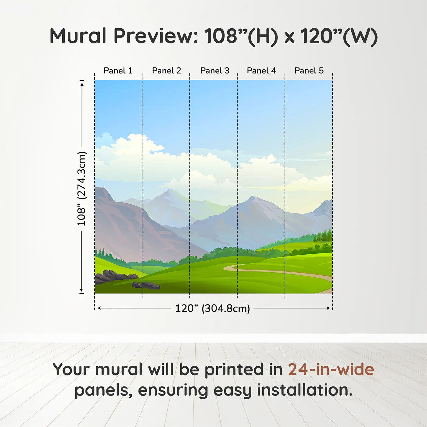 This beautiful landscape wall mural depicts a winding path through vibrant green, rolling hills. With distant mountains and a clear blue sky, this scenic view creates a feeling of peace, freedom, and adventure. It's a perfect calming backdrop for a nursery or playroom.