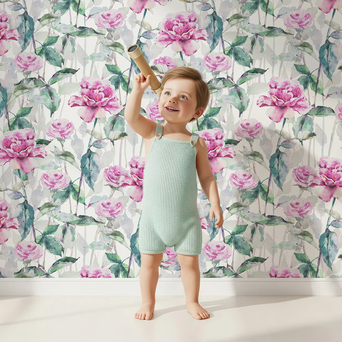 This beautiful floral wallpaper brings the classic charm of a rose garden into your child's room. Delicate climbing vines with sweet pink and blue flowers create a timeless and romantic pattern on a clean white background. It's a perfect choice for a nursery that will feel elegant for years to come.