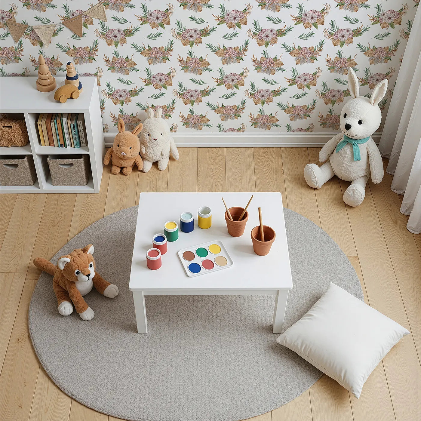 This floral wallpaper adds a touch of rustic nature and warmth to their special space. Our self-adhesive wallpaper is made-to-order and renter-friendly, making it simple for busy parents to create a beautiful accent wall. All our wallpapers are printed with GREENGUARD Gold Certified inks.