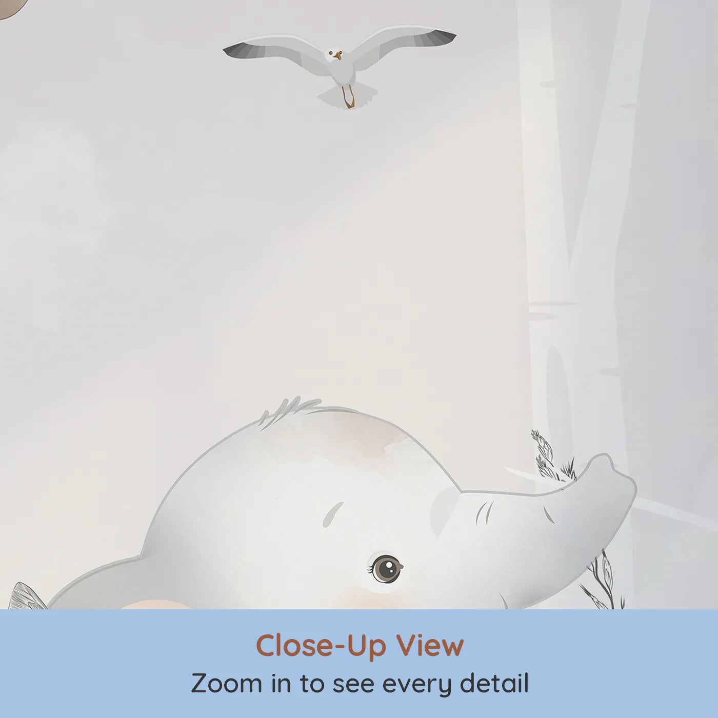 This beautiful and imaginative wall mural features a group of safari animals, including a giraffe and an elephant, in a serene, snowy birch forest. The unexpected combination and gentle, painterly style create a unique and magical scene, perfect for a sophisticated and whimsical nursery.