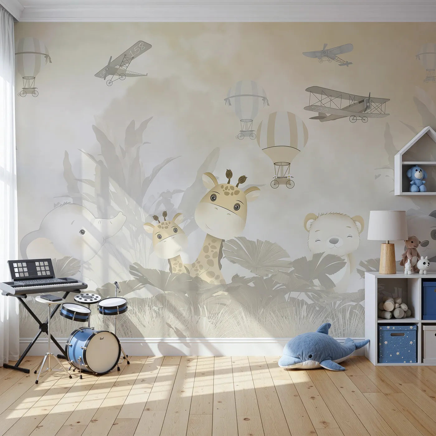 This fun and imaginative wall mural features a team of cute safari animals- including an elephant, giraffe, and bear- with vintage biplanes and hot air balloons. The charming, hand-drawn style and soft, neutral colors create a timeless and adventurous feel, perfect for a gender-neutral nursery or playroom.