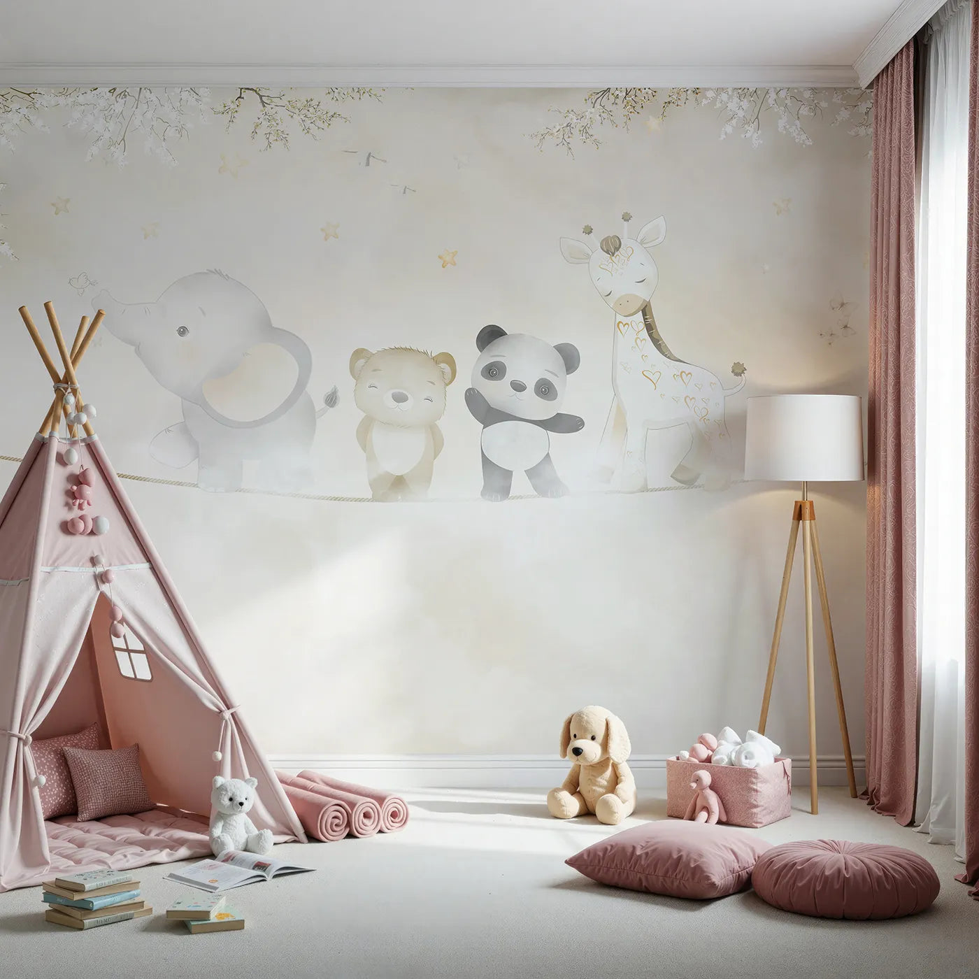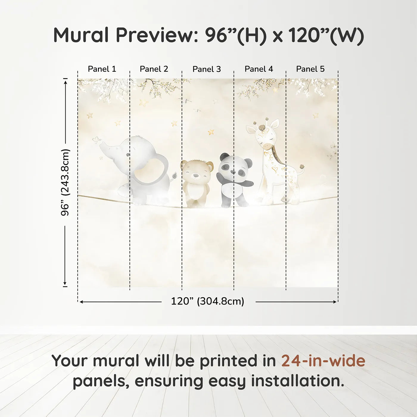 This charming kids wallpaper adds a touch of modern design to a classic animal theme. Our removable wallpaper is made-to-order and easy to install, so busy families can create a stylish and joyful space in no time. All our murals are printed with GREENGUAR Gold Certified inks.
