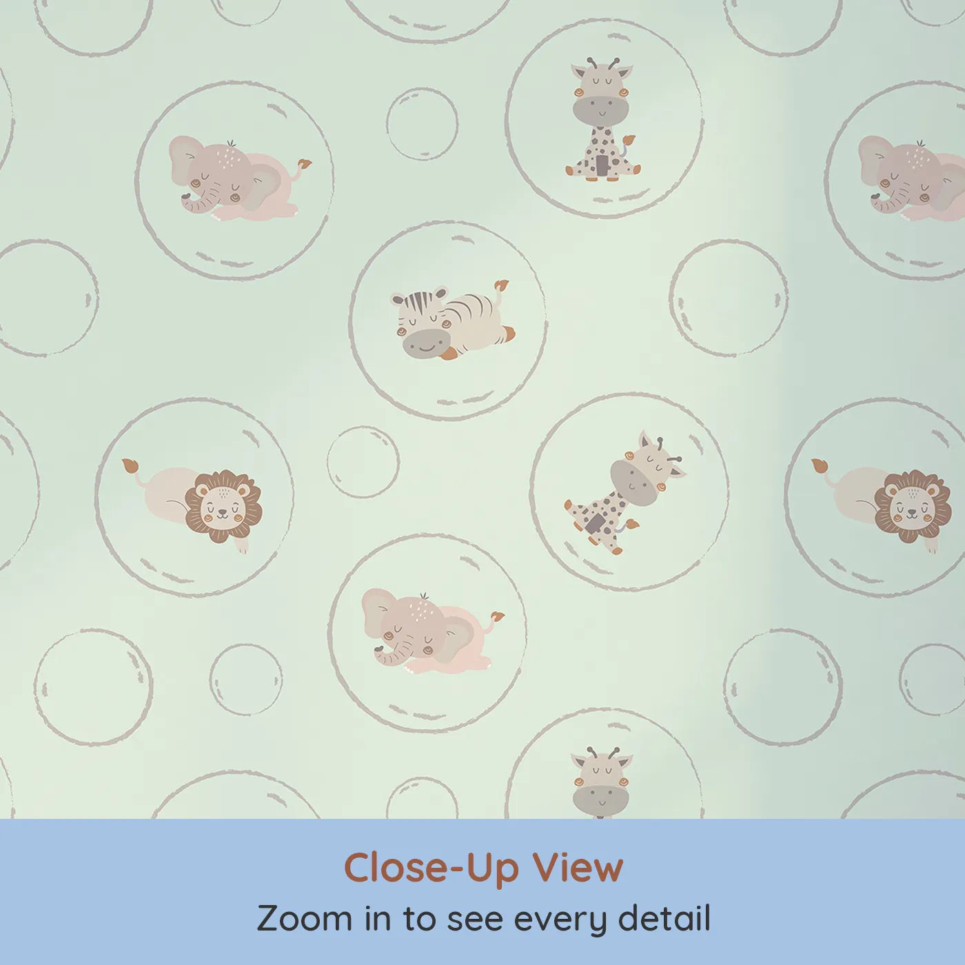 This charming nursery wallpaper features a sweet and imaginative scene of safari animals like lions, elephants, zebras, and giraffes floating peacefully inside delicate bubbles. The soft, neutral colors on a mint green background create a dreamy and calming atmosphere perfect for a nursery.