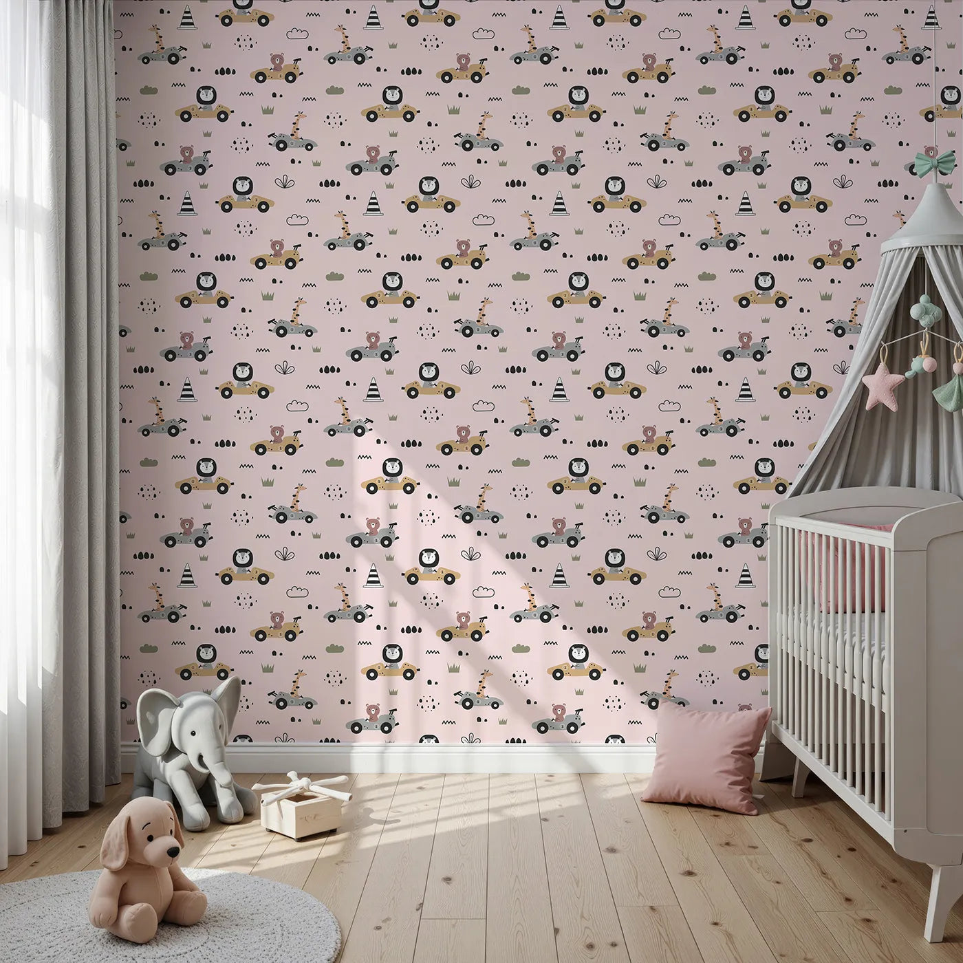 This fun cars wallpaper features a delightful race between safari animals in colorful cars. A lion, elephant, and giraffe zoom past in a simple, modern style on a blush pink background, creating a playful and energetic scene that will delight any child who loves cars and animals.
