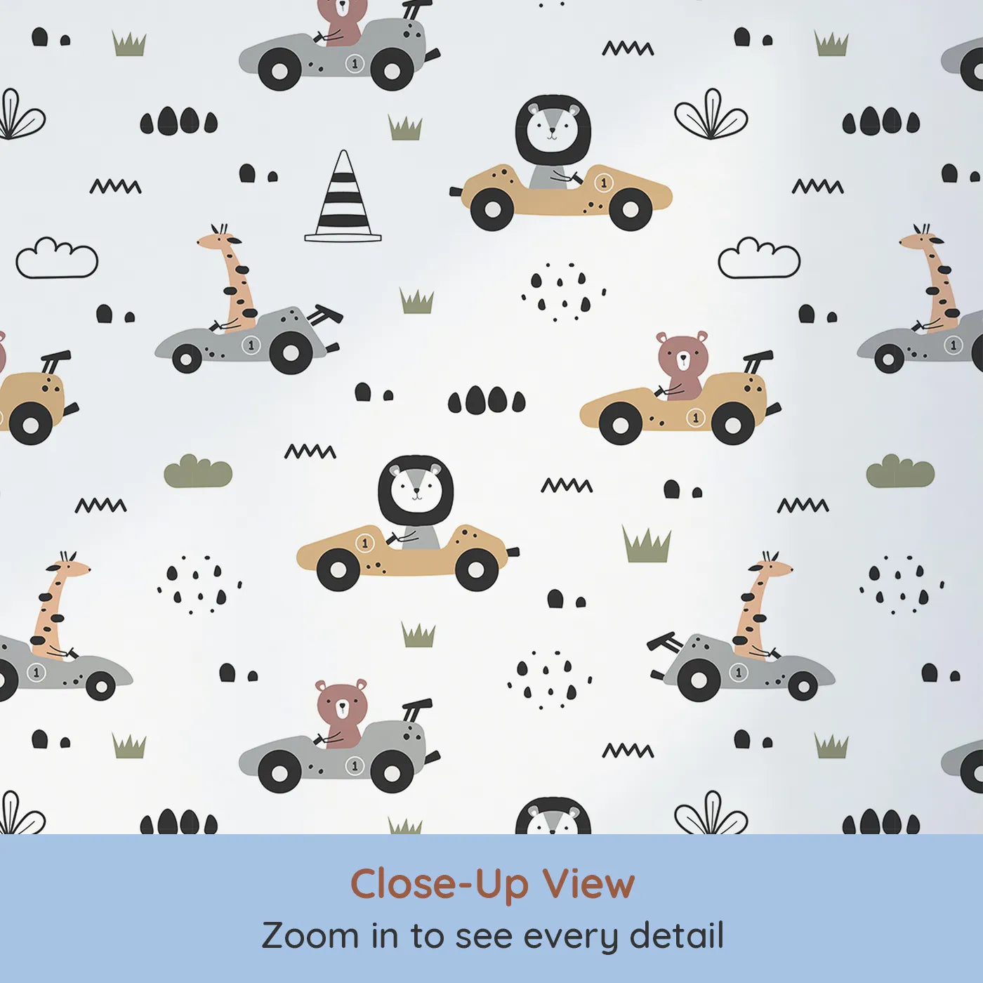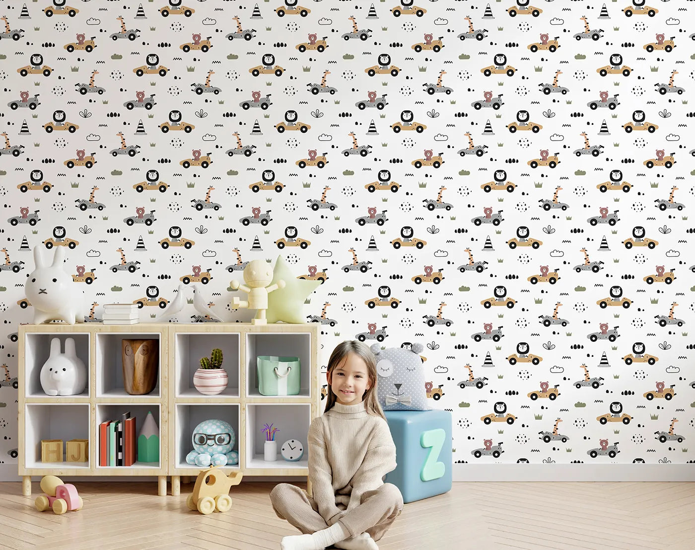This fun cars wallpaper features a delightful race between safari animals in colorful cars. A lion, elephant, and giraffe zoom past in a simple, modern style on a clean white background, creating a playful and energetic scene that will delight any child who loves cars and animals.