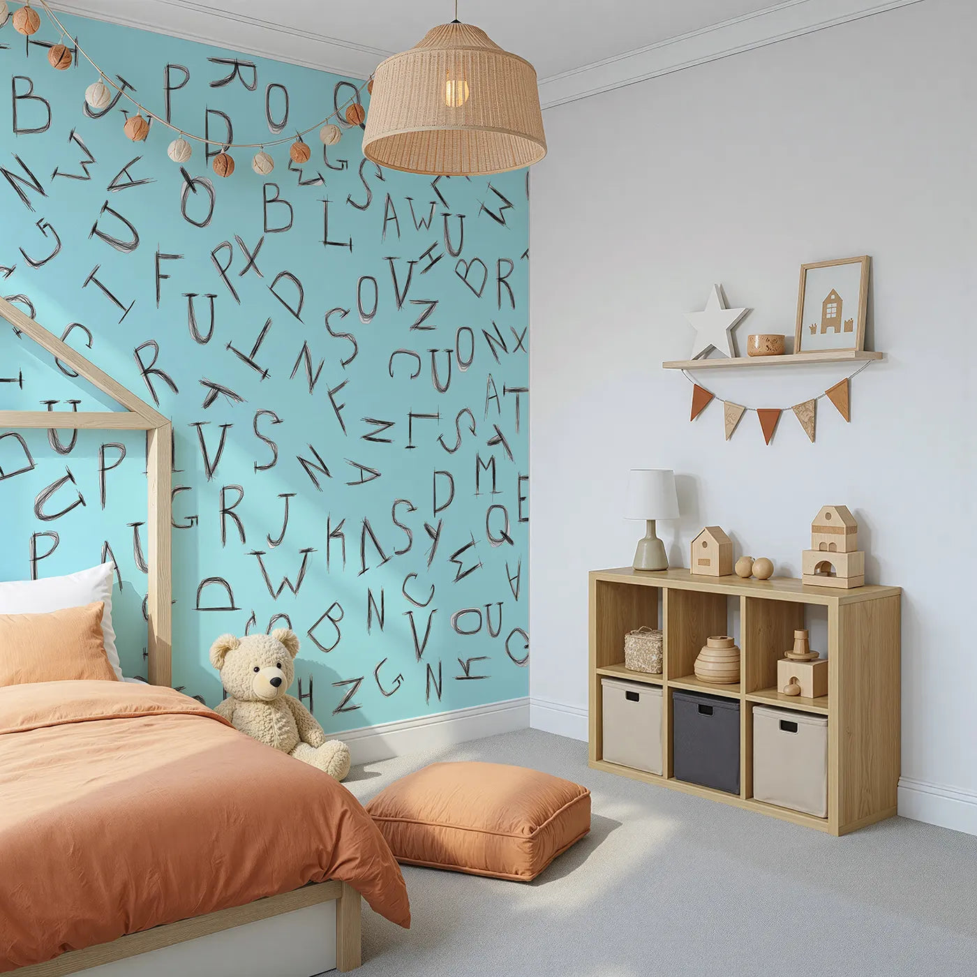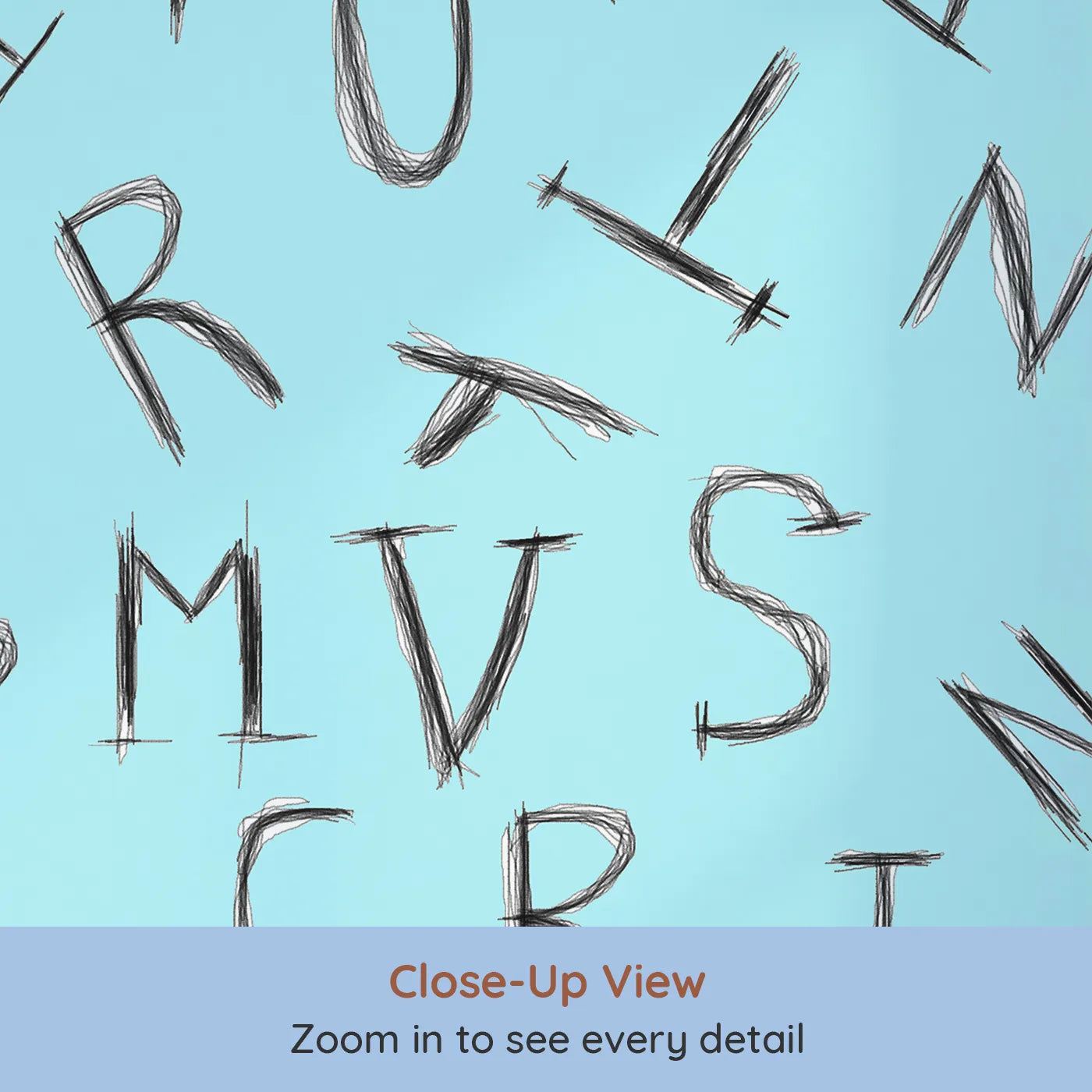 This fun and educational wall mural is perfect for a curious little learner. A random assortment of hand-drawn letters is scattered across a calm blue background, creating a playful and engaging design. This alphabet wallpaper makes a stylish addition to a nursery, toddler room, or playroom.
