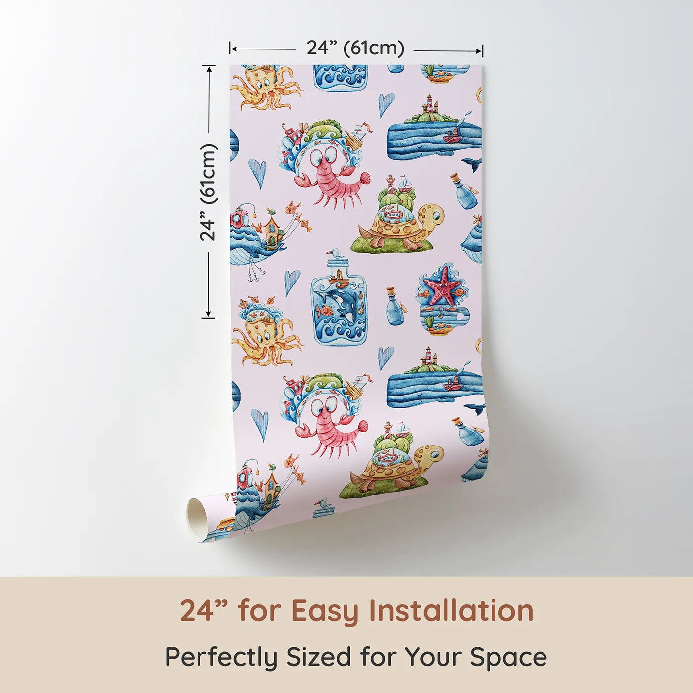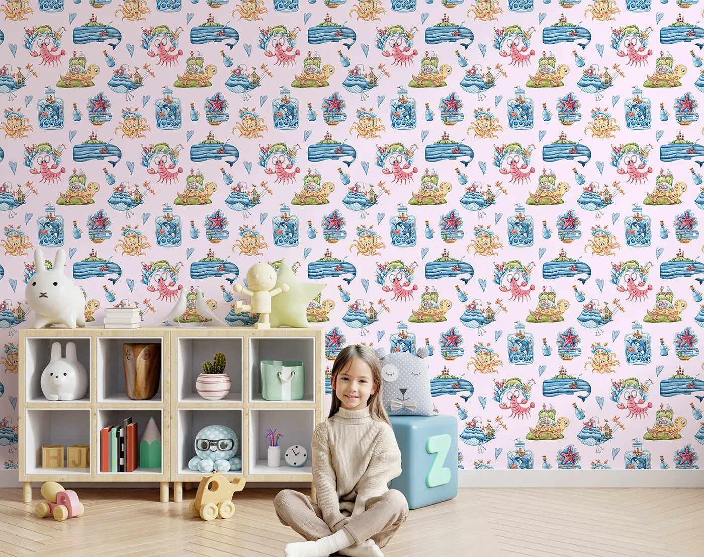 This charming girls wallpaper is like a storybook come to life! On a soft pink background, whimsical sea creatures fill the scene, from an octopus in a top hat to a turtle with a town on its shell. Each character is full of personality, creating an imaginative world for your little one to explore.