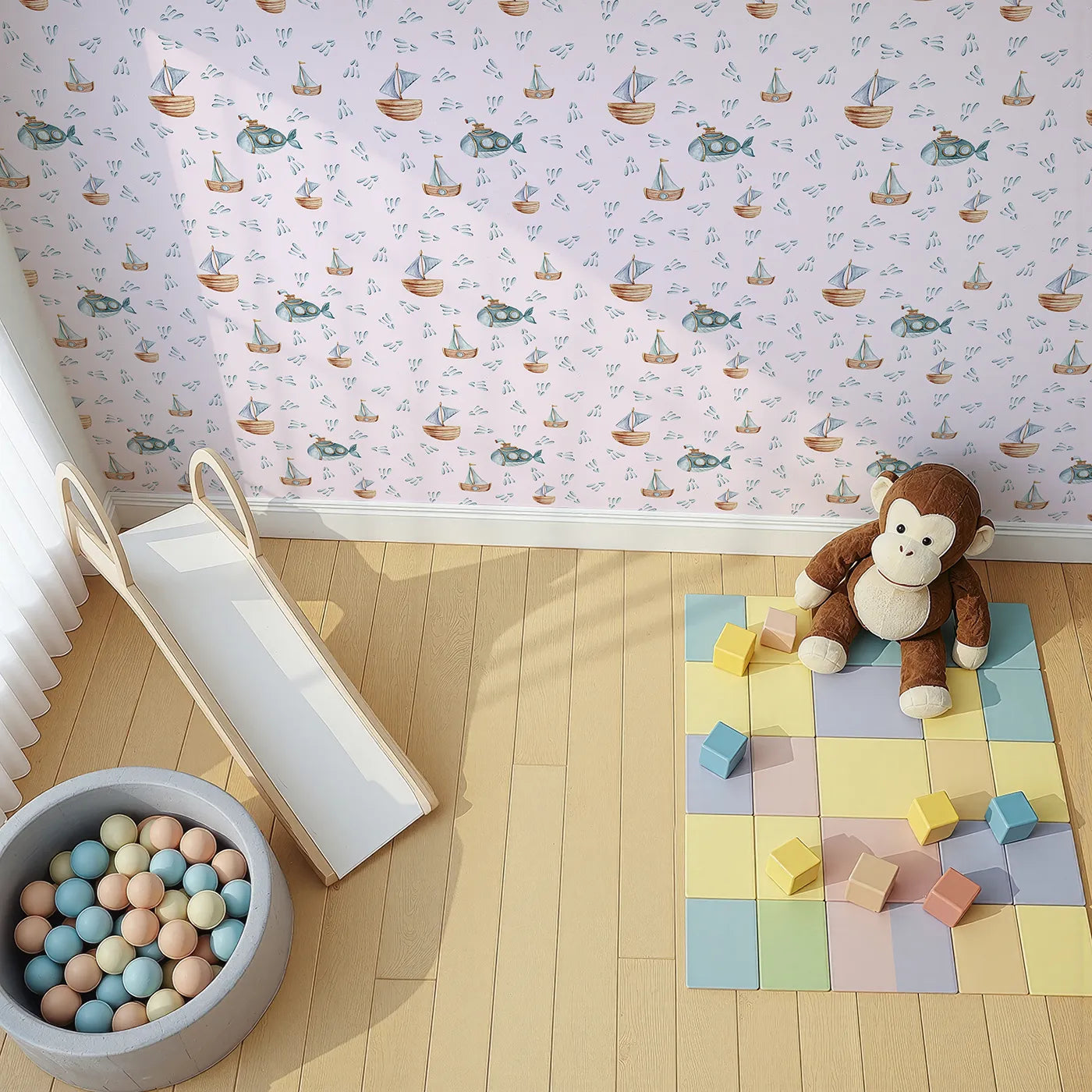 This charming kids wallpaper features a delightful parade of watercolor sailboats and a friendly submarine, surrounded by playful splashes. The gentle blues and browns on a pink background create a classic nautical theme with a soft, modern twist.