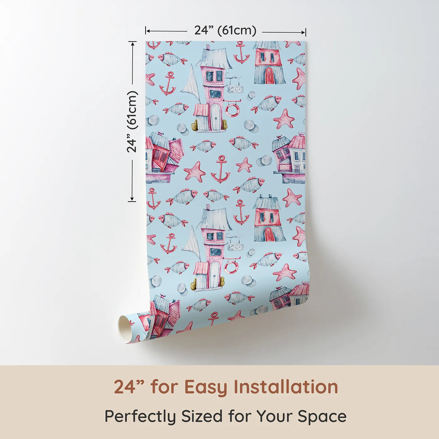 Let their imagination grow with this whimsical seaside wallpaper. A delightful town of watercolor houses, fish, and anchors sits happily under a calm, sky-blue background. This design is perfect for creating a playful and imaginative space for any little dreamer.