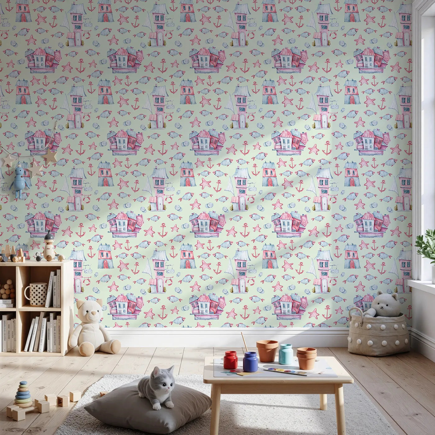 This enchanting kids wallpaper features a whimsical seaside village of houses, fish, and anchors set against a refreshing mint green background. The playful watercolor illustrations create a fun and serene atmosphere perfect for a gender-neutral nursery or playroom.