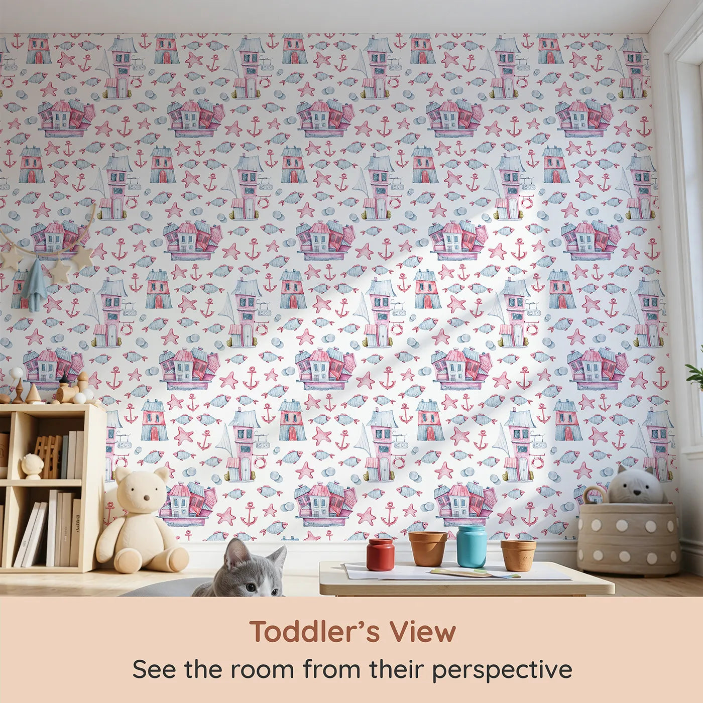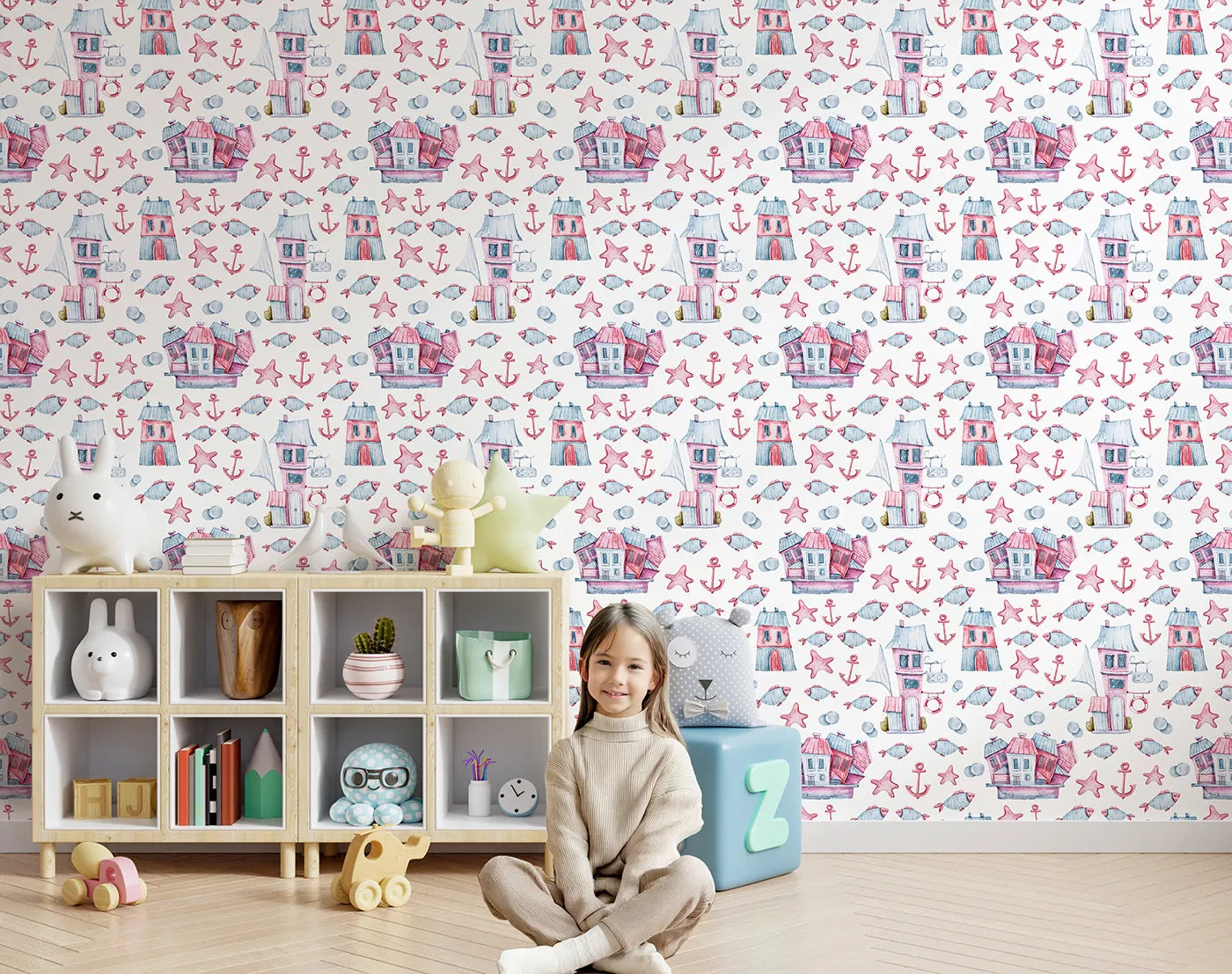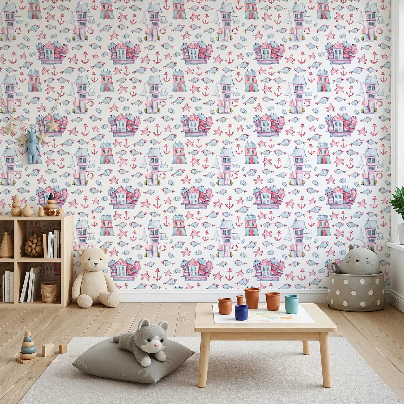 This charming kids wallpaper features a playful parade of whimsical seaside houses, friendly fish, starfish, and anchors. The fun watercolor design in soft pinks and blues on a clean white background creates an airy and imaginative scene perfect for a nursery or playroom.