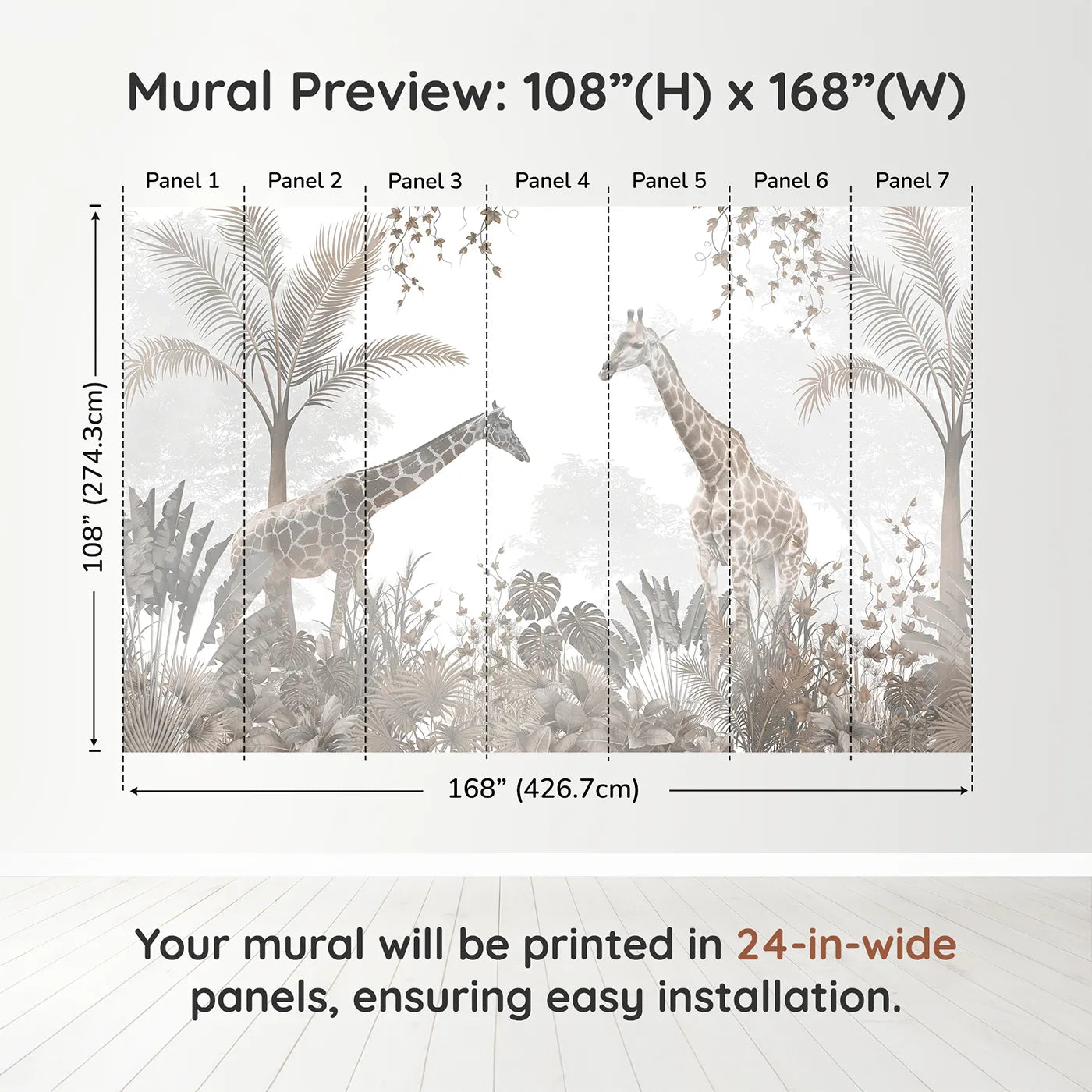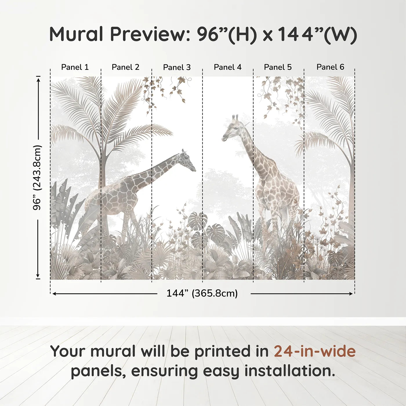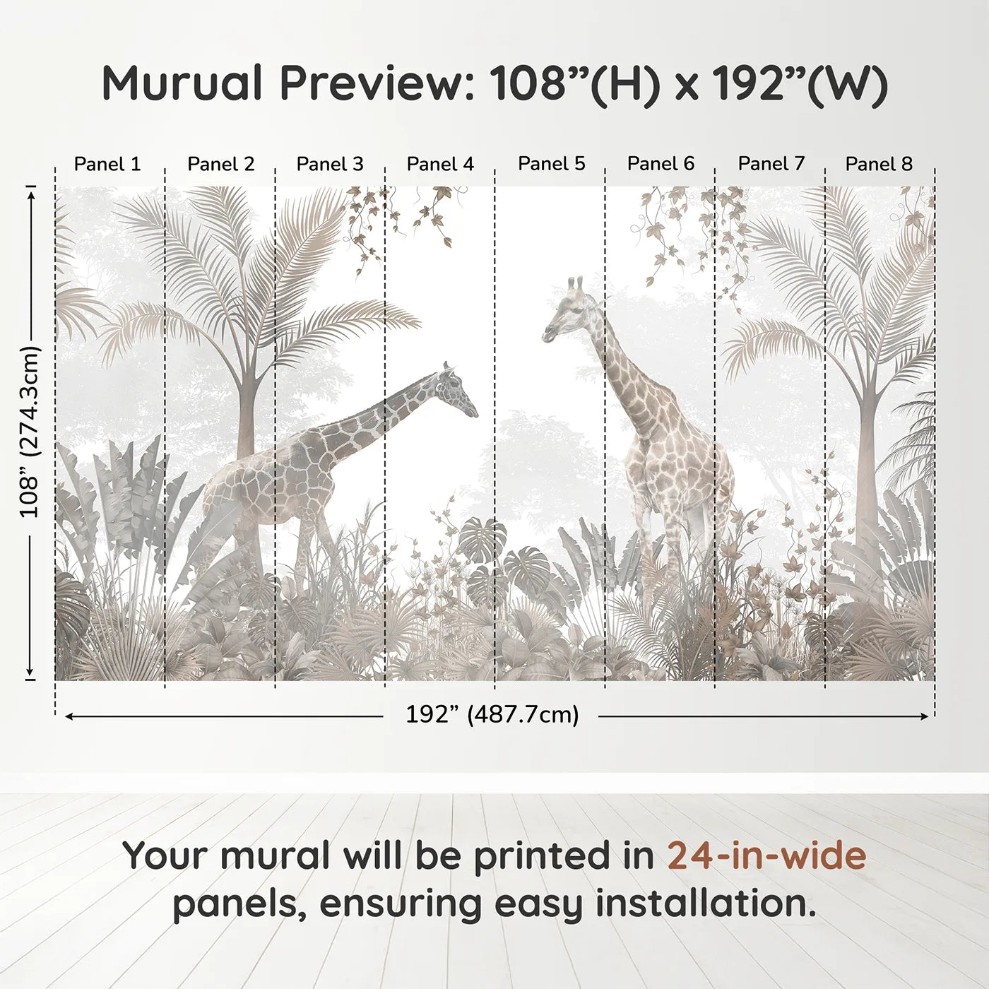 This stunning and sophisticated wall mural depicts a dense jungle landscape in beautiful sepia tones. The vintage-inspired illustration style, with detailed palm trees and lush foliage, creates a sense of timeless adventure and mystery. It's perfect for a chic, gender-neutral nursery or a curious explorer's room.
