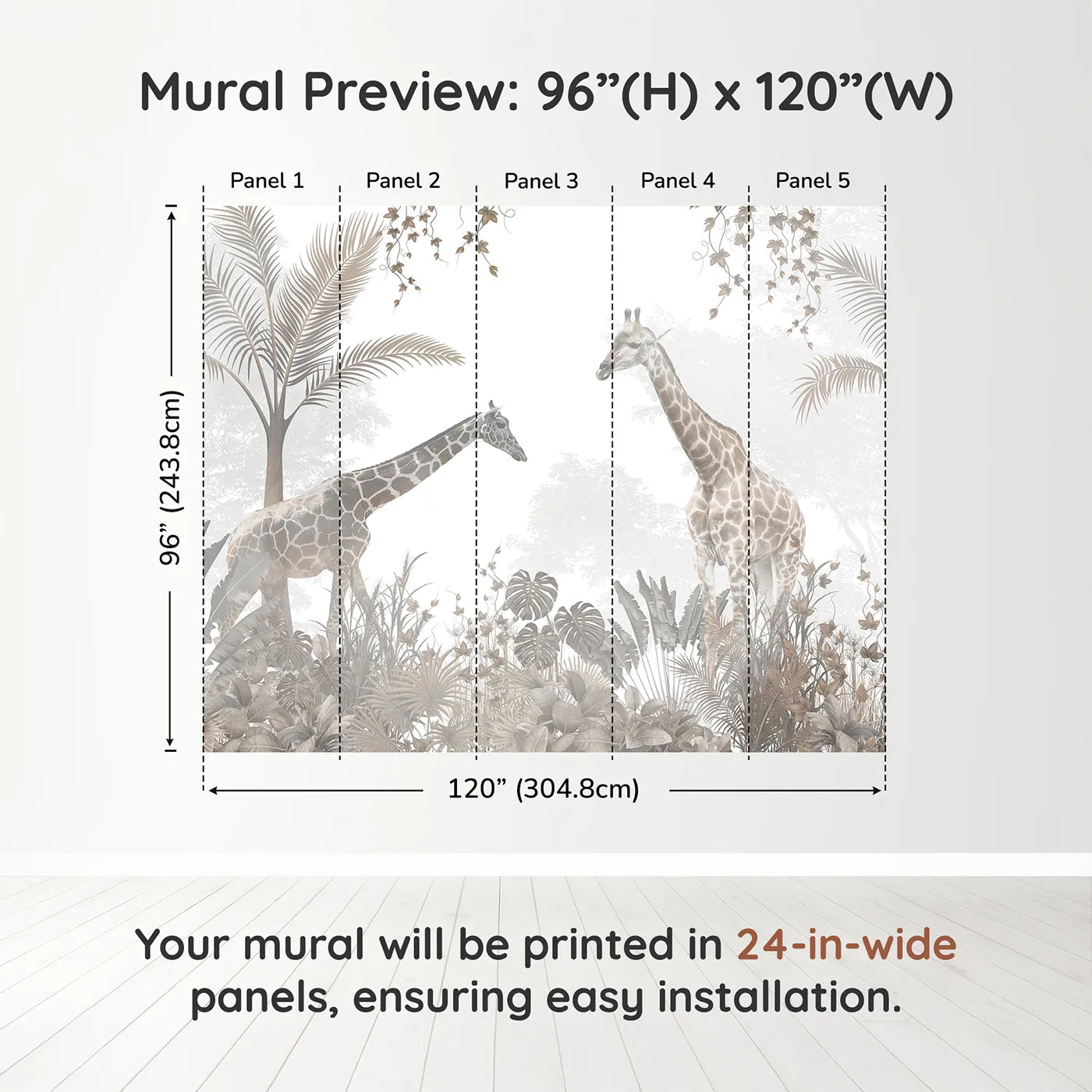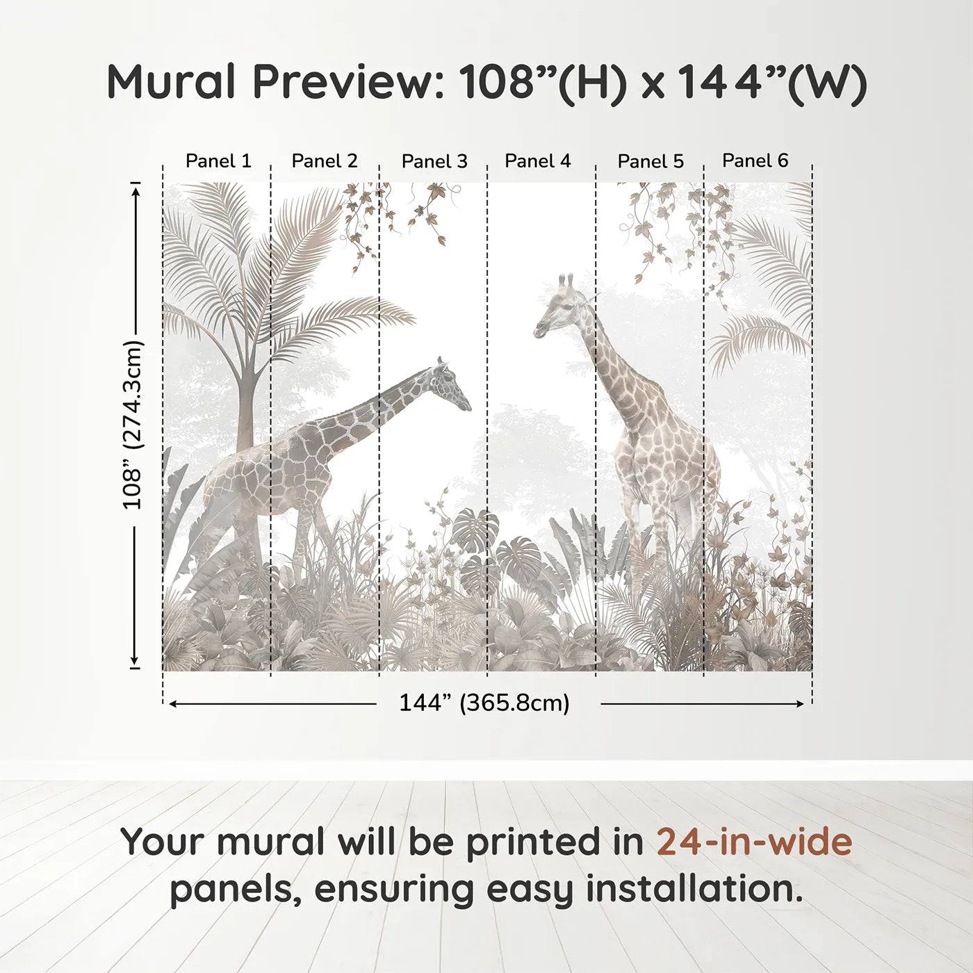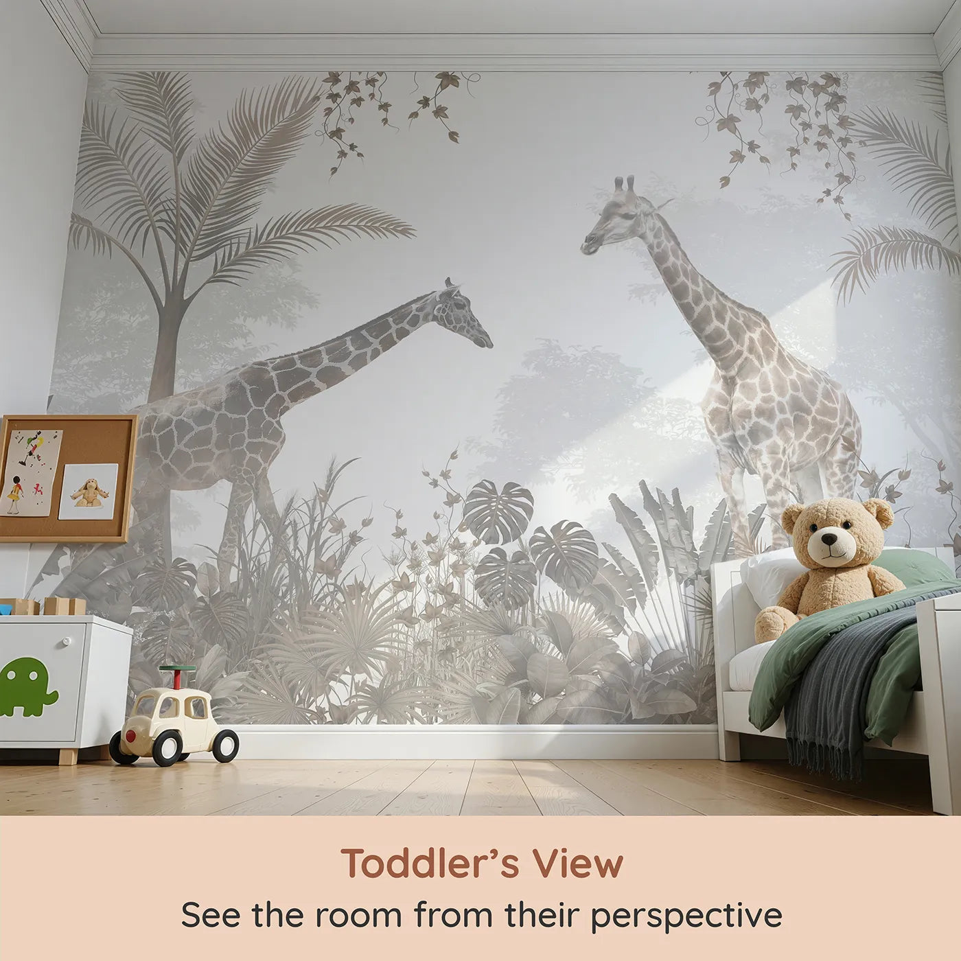 This stunning and sophisticated wall mural depicts a dense jungle landscape in beautiful sepia tones. The vintage-inspired illustration style, with detailed palm trees and lush foliage, creates a sense of timeless adventure and mystery. It's perfect for a chic, gender-neutral nursery or a curious explorer's room.
