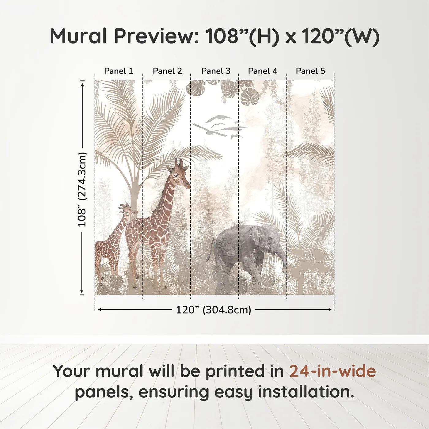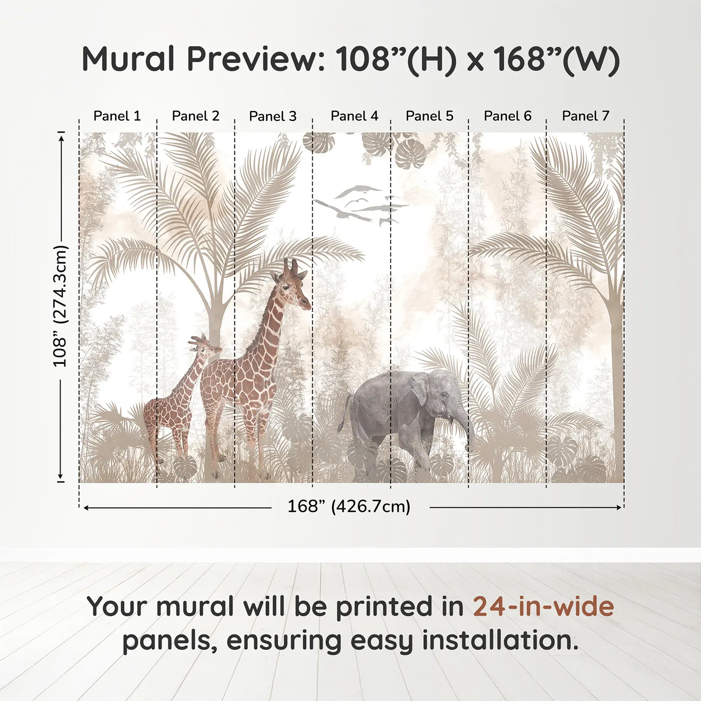 This stunning and sophisticated wall mural depicts a herd of elephants and giraffes on the savanna in beautiful sepia tones. The realistic yet gentle style and misty background create a sense of timeless wonder and adventure. It's perfect for a chic, gender-neutral nursery or a curious explorer's room.