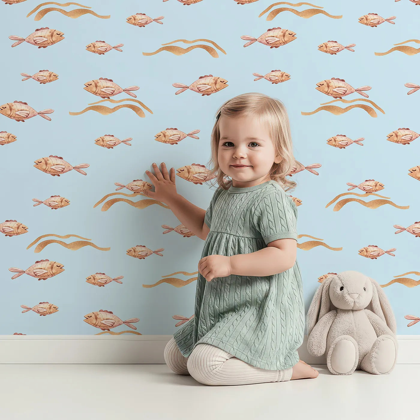 This sweet and simple kids wallpaper features a pattern of sleepy watercolor fish swimming gently across a sky blue background. The warm tones of the fish create a soft and calming feel, making it an ideal choice for a serene nursery or a minimalist playroom.