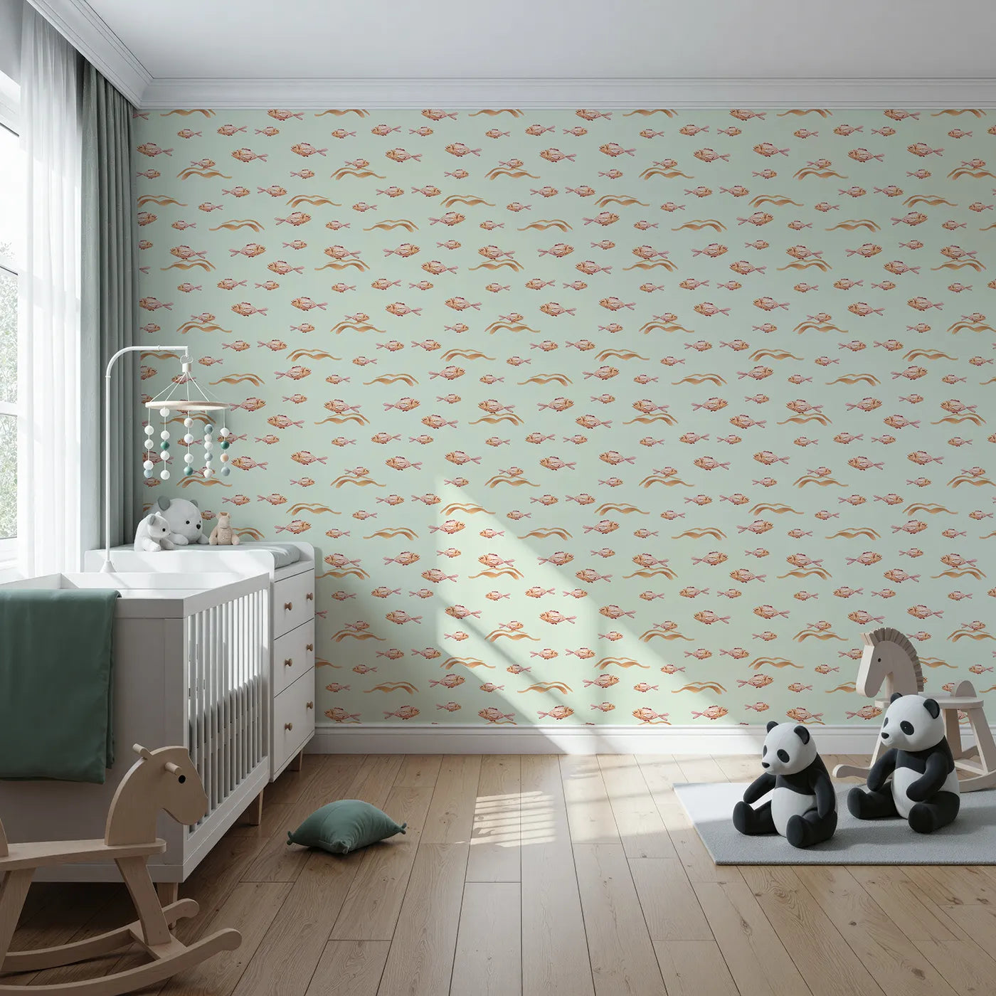 | Design | Sleepy Blush Fish Wallpaper in Mint Green |