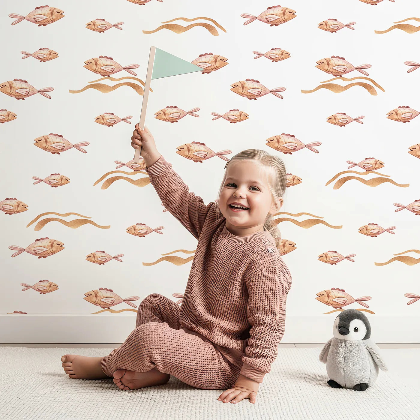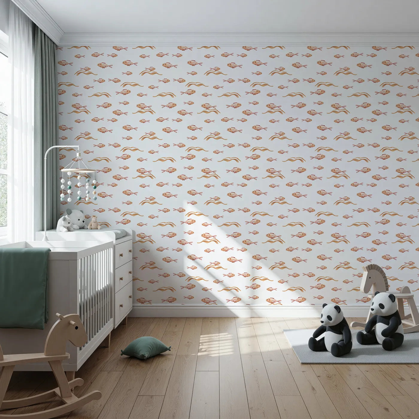 This sweet and simple kids wallpaper features a pattern of sleepy watercolor fish swimming gently across a crisp white background. The warm, blush tones of the fish create a soft and calming feel, making it an ideal choice for a serene nursery or a minimalist playroom.