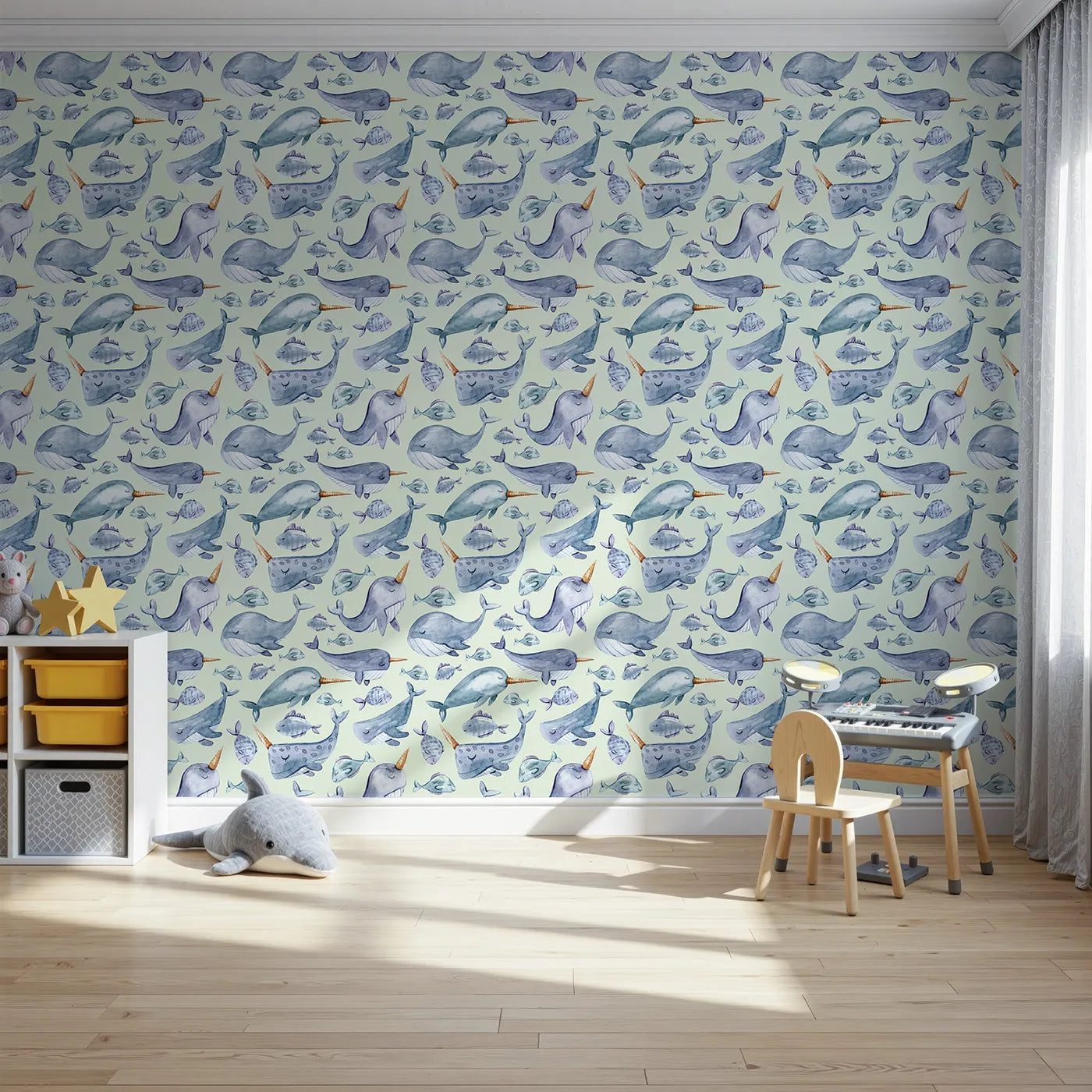 This enchanting kids wallpaper features a whimsical group of sleepy whales, narwhals, and fish painted in soft watercolor blues, all floating on a refreshing mint green sea. The design is perfect for a gender-neutral nursery, creating a space that feels both fun and serene.