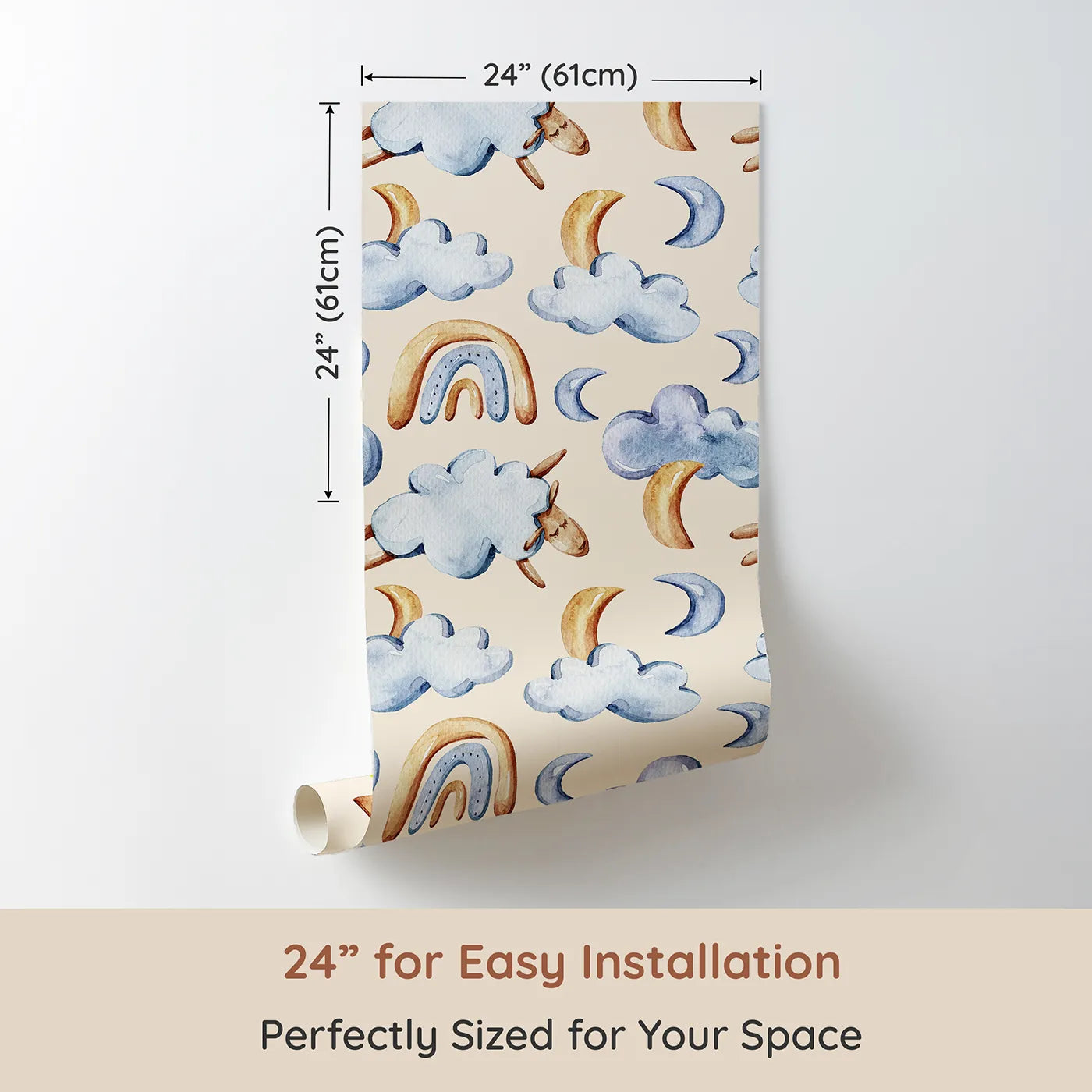 This charming nursery wallpaper features sleepy sheep, fluffy clouds, crescent moons, and rainbows on a warm cream background. The gentle, imaginative pattern creates a cozy and soothing environment, perfect for sparking sweet dreams and bedtime stories with your little one.
