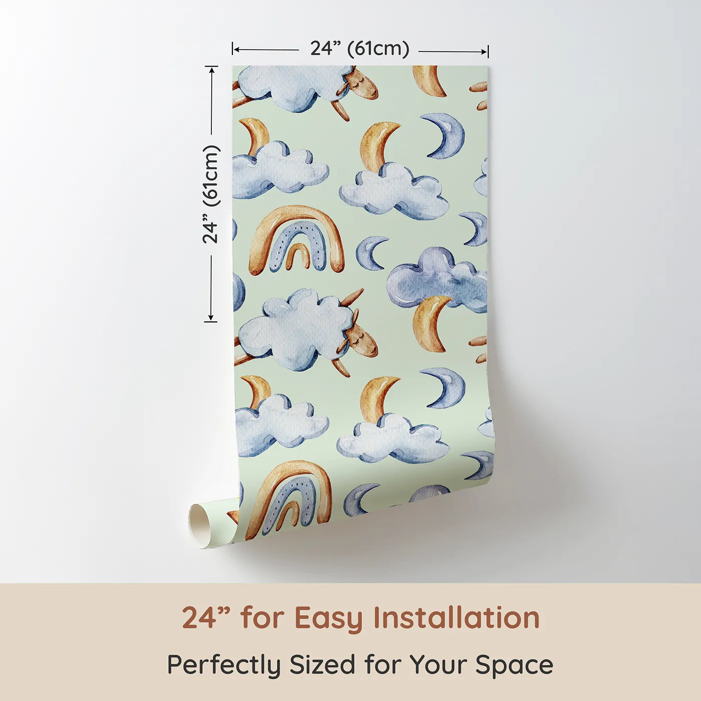 This enchanting kids wallpaper features a whimsical pattern of sleepy sheep, clouds, moons, and rainbows against a refreshing mint green background. The playful design is perfect for a gender-neutral nursery, creating a space that feels both fun and serene.