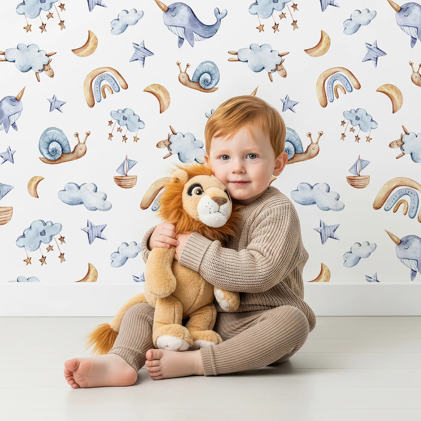 This charming kids wallpaper features a delightful parade of sleepy sky friends. Gentle narwhals, fluffy sheep, happy snails, and little sailboats drift among soft clouds, moons, and rainbows. The sweet watercolor illustrations create a soothing world that sparks imaginative bedtime stories.