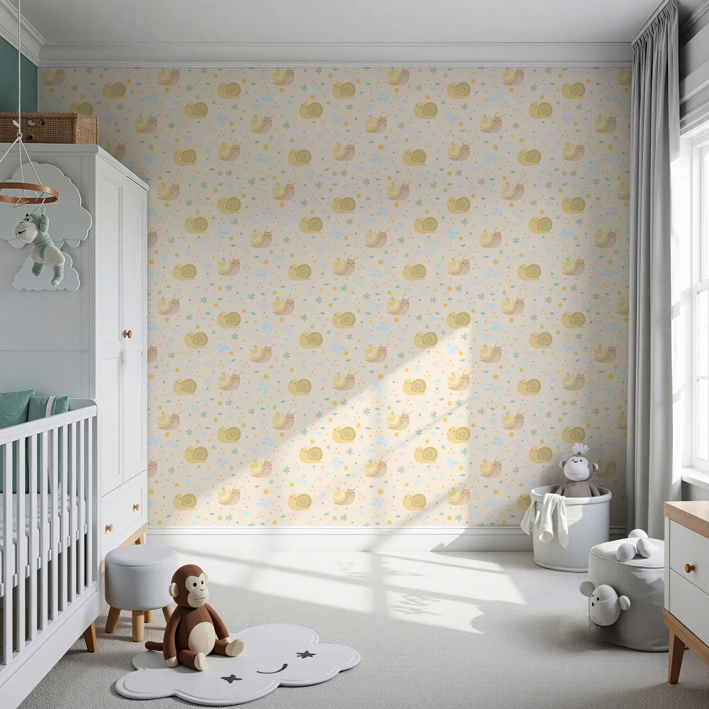 This charming kids wallpaper features a delightful pattern of smiling snails exploring a gentle meadow on a warm cream background. The soft colors and playful design create a cozy atmosphere that's perfect for a nursery, sparking curiosity about the tiny wonders of nature.