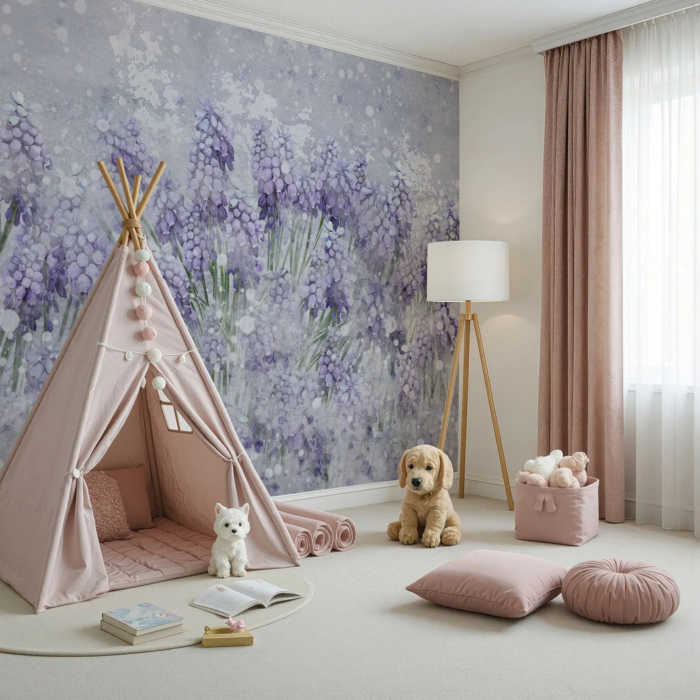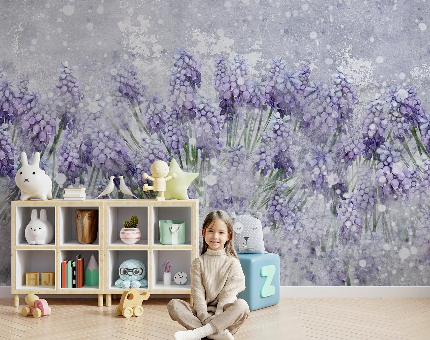 This beautiful and unique floral wall mural captures a dreamy, imaginative scene. A field of purple hyacinth flowers stands in a gentle, sparkling snowfall. The soft, painterly style and cool colors create a magical and serene atmosphere, perfect for a nursery or child's bedroom.