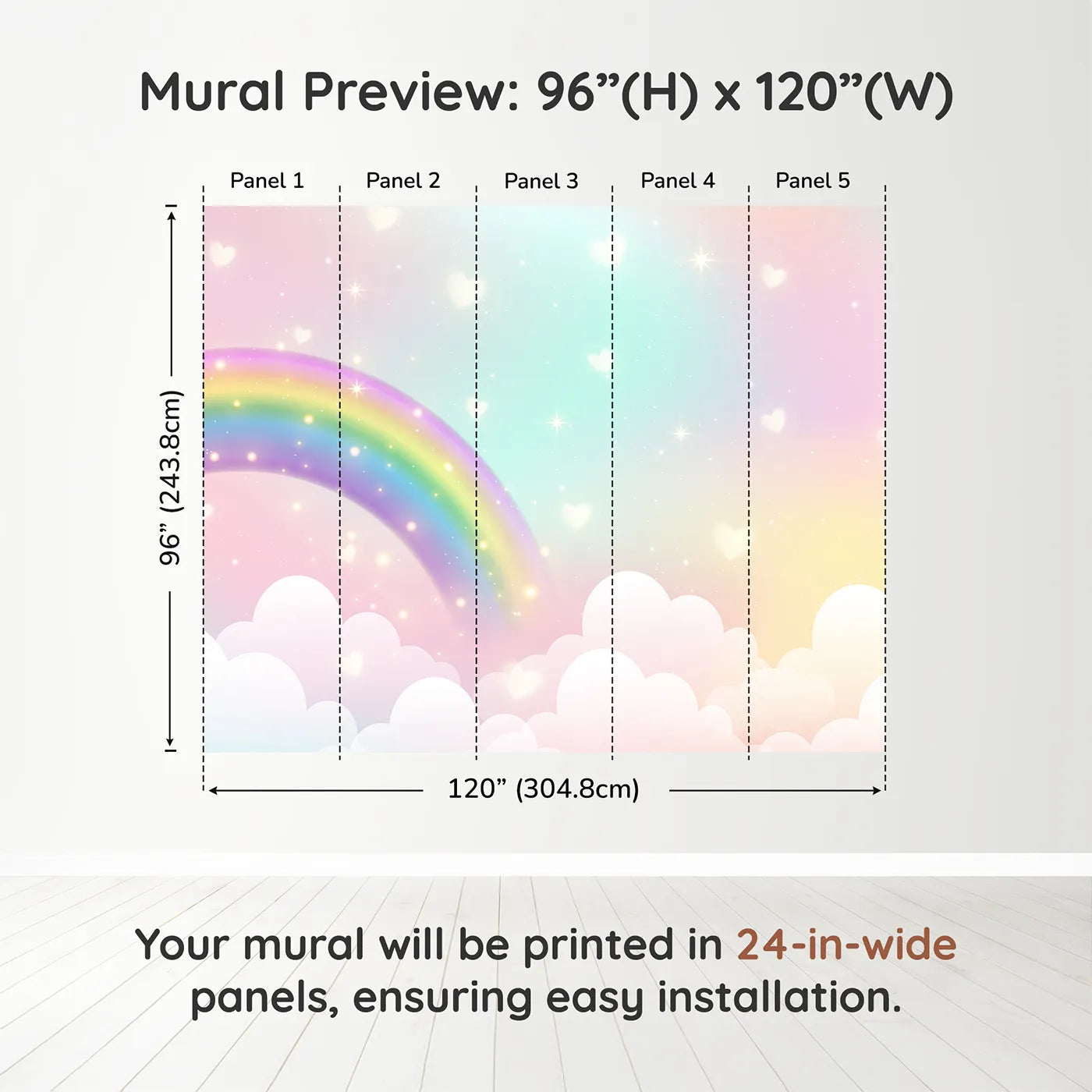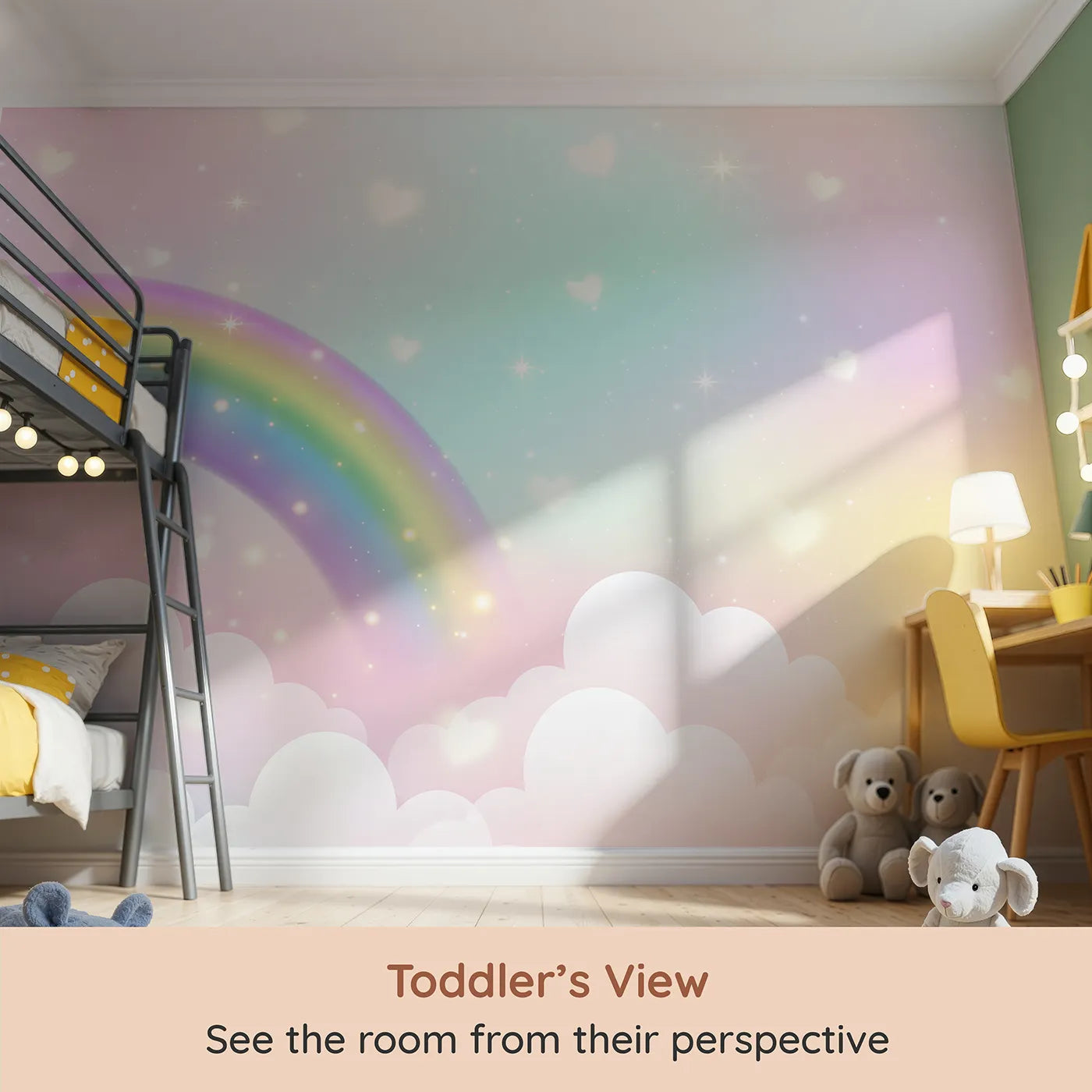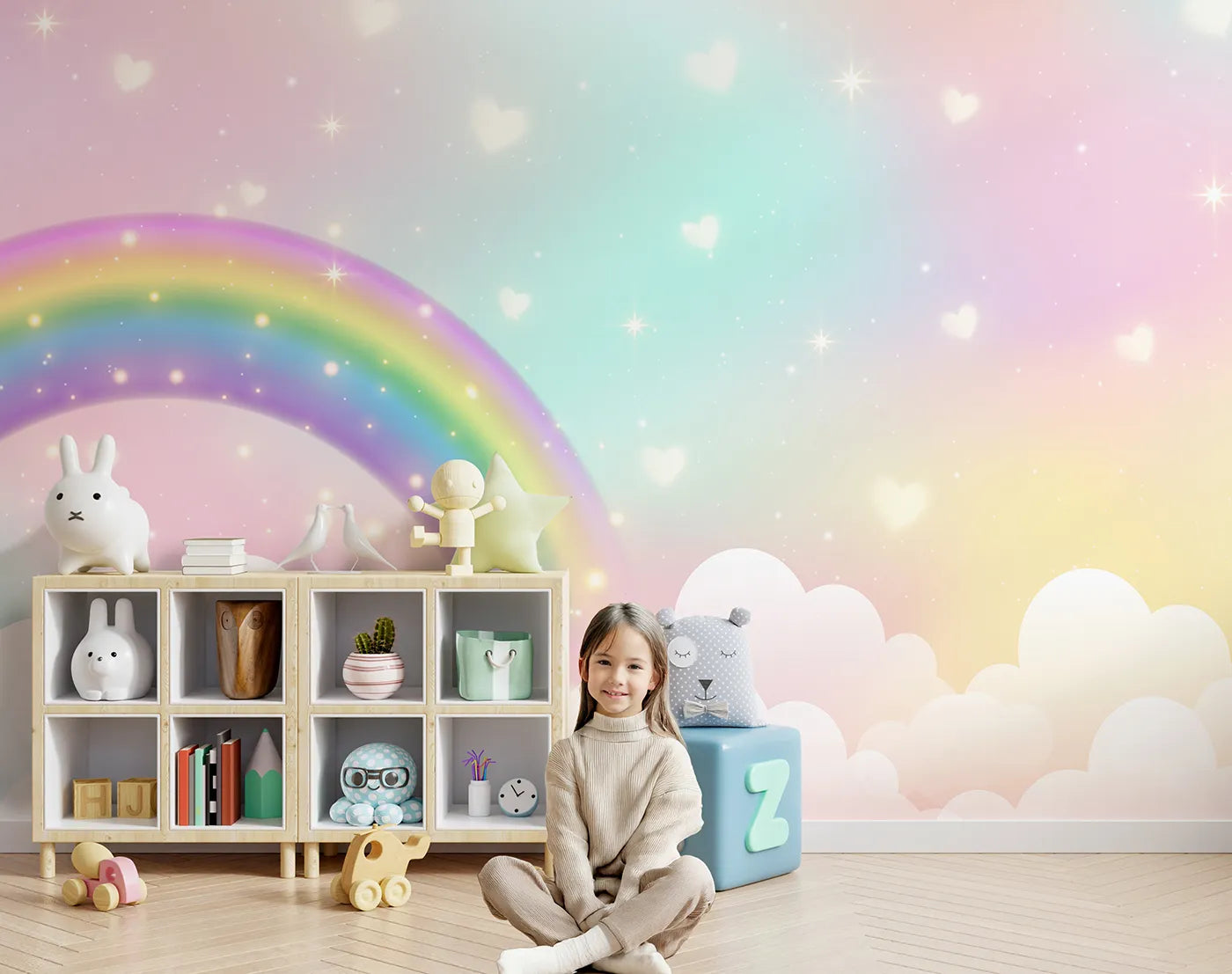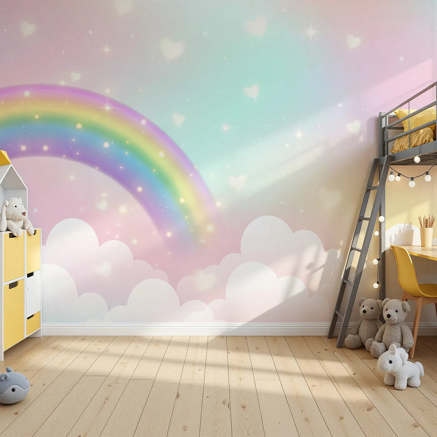 This charming wall mural creates a dreamy and magical atmosphere in any child's room. A beautiful pastel rainbow arches across a soft, sparkling sky filled with glowing hearts and twinkling stars. It's a sweet and enchanting design perfect for a nursery or playroom.
