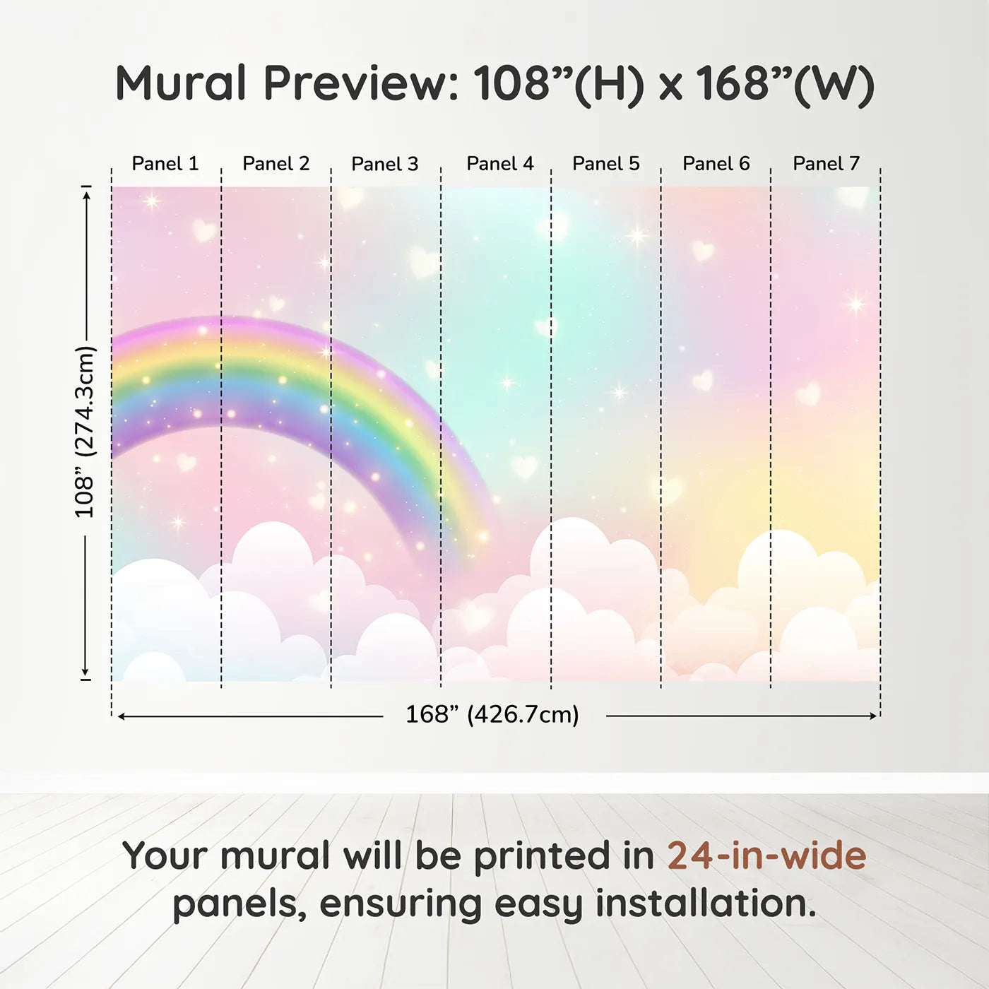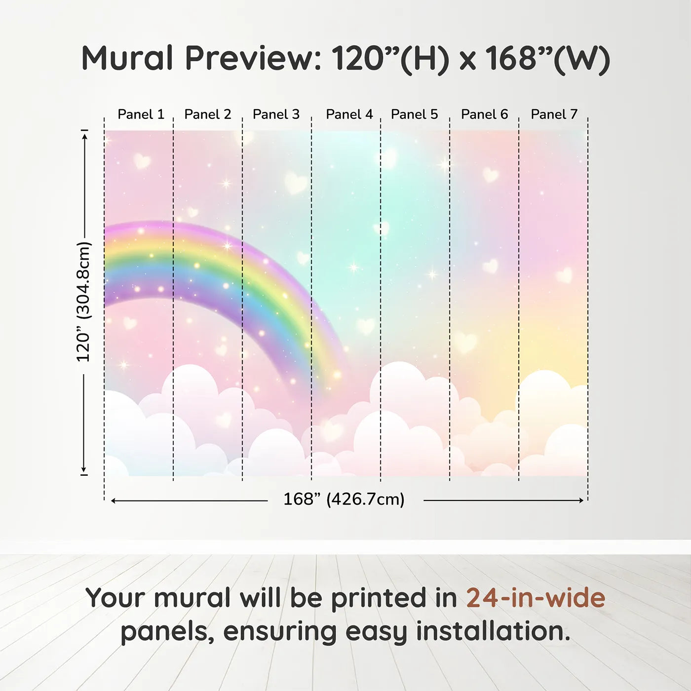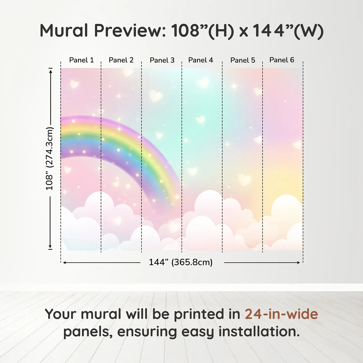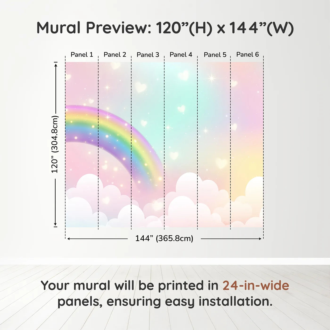 This charming wall mural creates a dreamy and magical atmosphere in any child's room. A beautiful pastel rainbow arches across a soft, sparkling sky filled with glowing hearts and twinkling stars. It's a sweet and enchanting design perfect for a nursery or playroom.