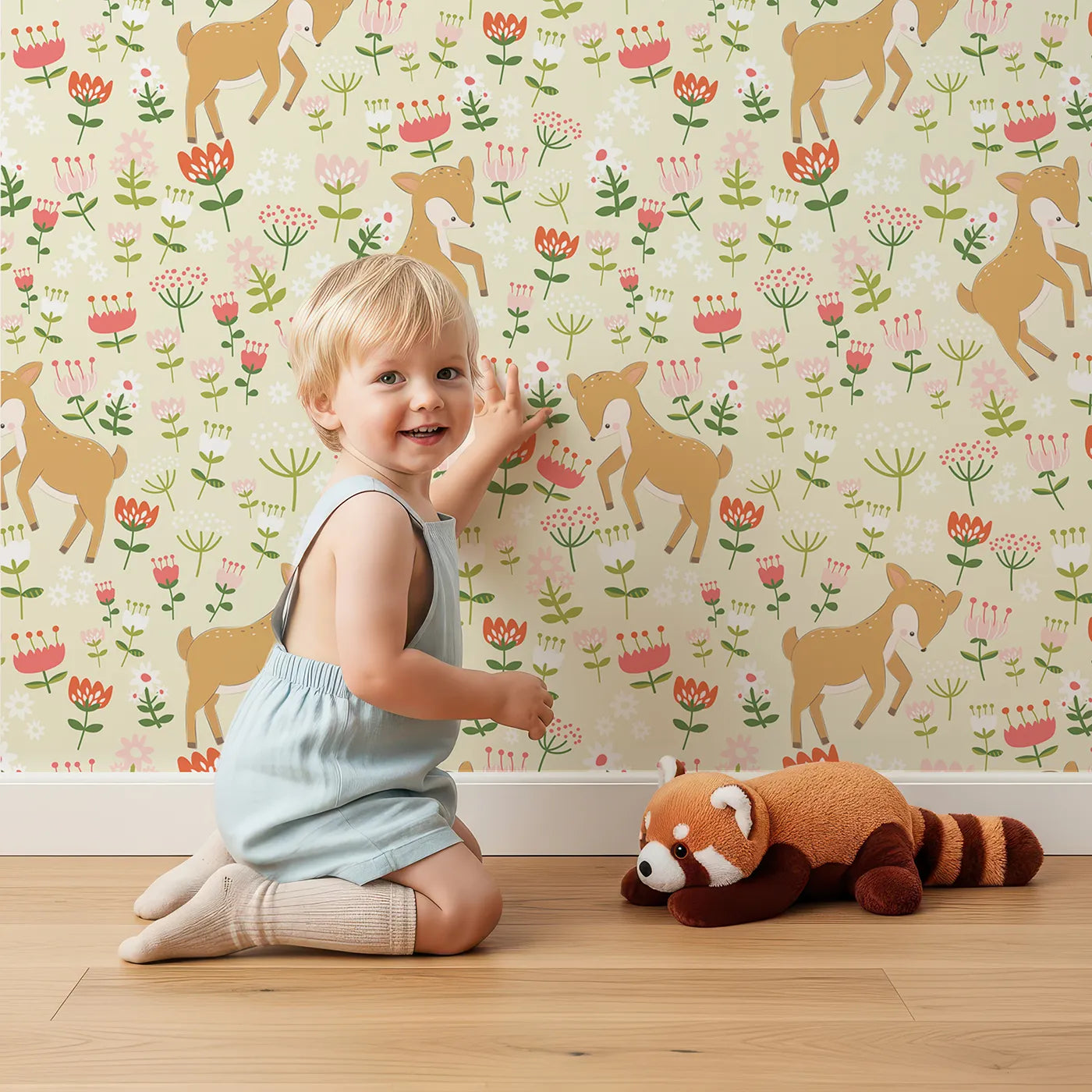 This charming nursery wallpaper features a pattern of sweet, sitting fawns amidst colorful wildflowers on a warm buttercream background. The gender-neutral design is both playful and calming, making it a perfect choice for a cozy nursery or a fun toddler room that inspires gentle play.