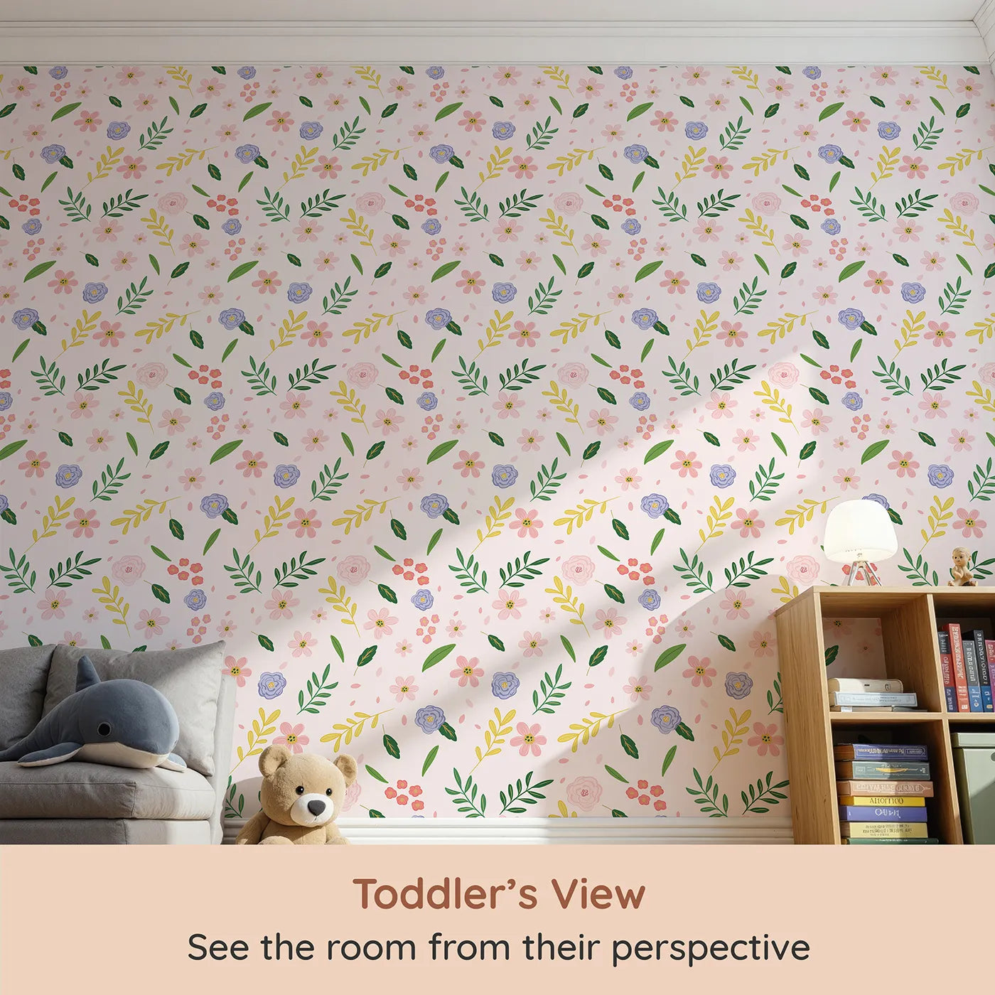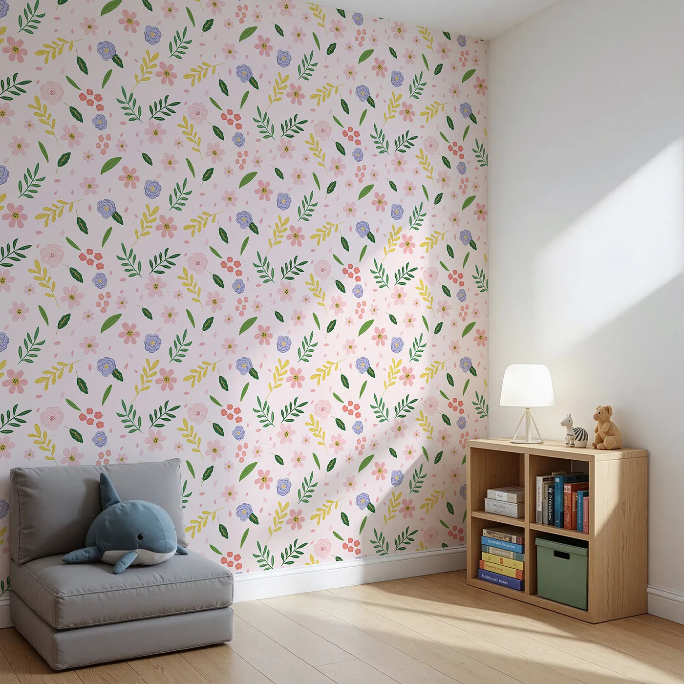 Bring the gentle beauty of a meadow indoors with this beautiful floral wallpaper. This charming kids wallpaper features a delightful pattern of simple, colorful flowers and leaves scattered on a soft pink background, creating a warm and cheerful atmosphere that grows with your little one.