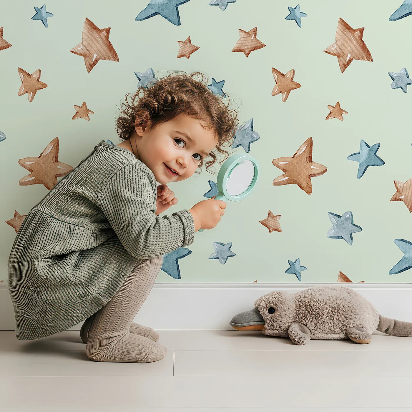 This charming space wallpaper features a playful pattern of hand-drawn, scribbled stars in warm brown and cool blue watercolors. Set against a green background, it has a modern, artistic feel that adds a touch of whimsy and wonder to a nursery or kid's room.