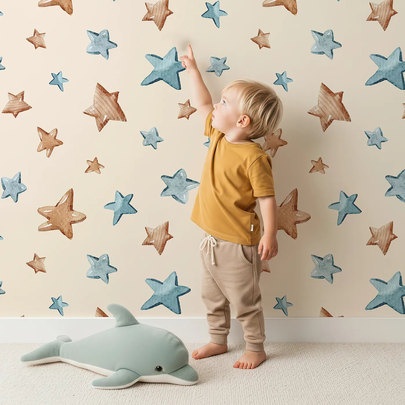 This charming space wallpaper features a playful pattern of hand-drawn, scribbled stars in warm brown and cool blue watercolors. Set against a sand background, it has a modern, artistic feel that adds a touch of whimsy and wonder to a nursery or kid's room.