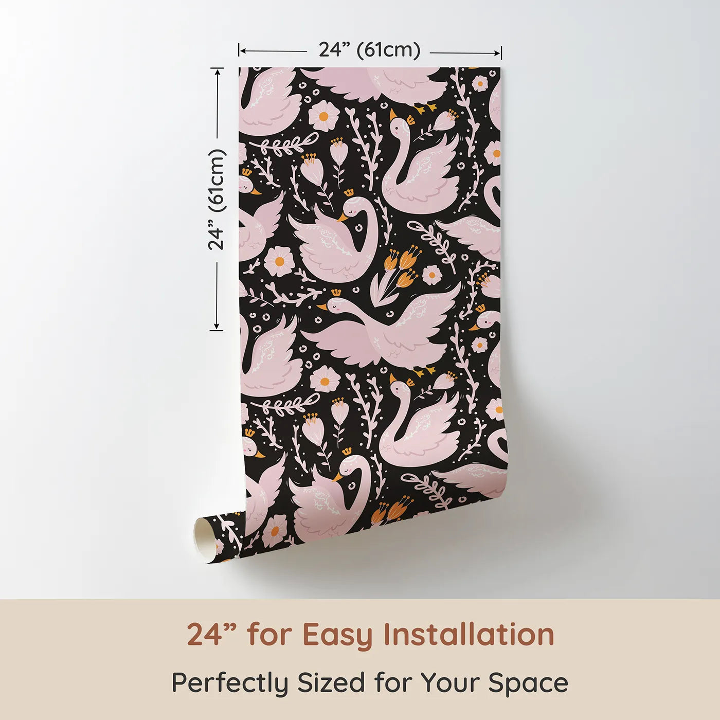 This striking kids wallpaper features a captivating pattern of intricately detailed black and white swans against a sophisticated charcoal black background. The monochrome feel with pops of color gives this design a modern, artistic edge that is perfect for a stylish, gender-neutral room.