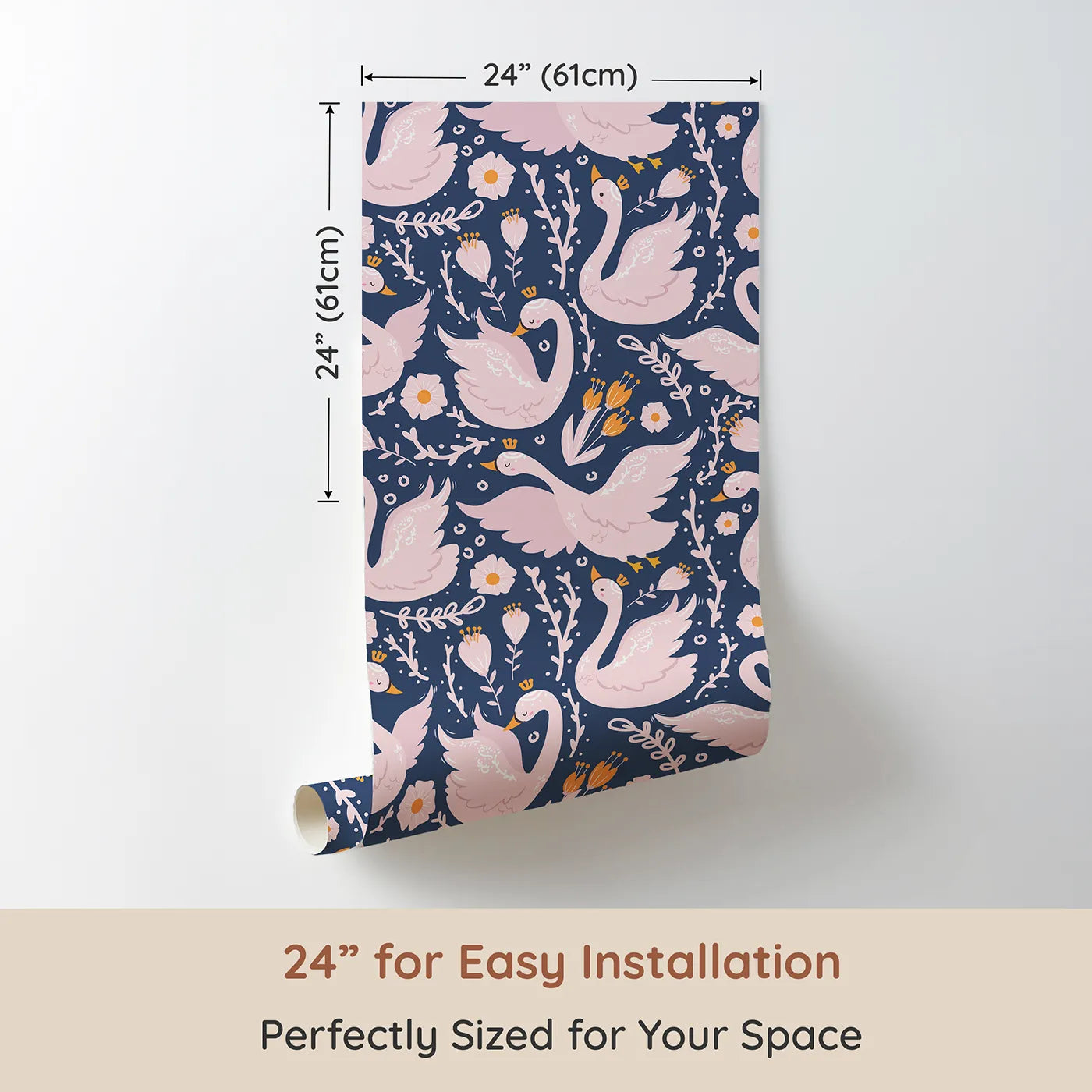 This striking kids wallpaper features a captivating pattern of black and white swans against a deep navy blue background. The dramatic and imaginative design creates a feeling of a magical midnight ballet, perfect for a room that sparks creativity and wonder.