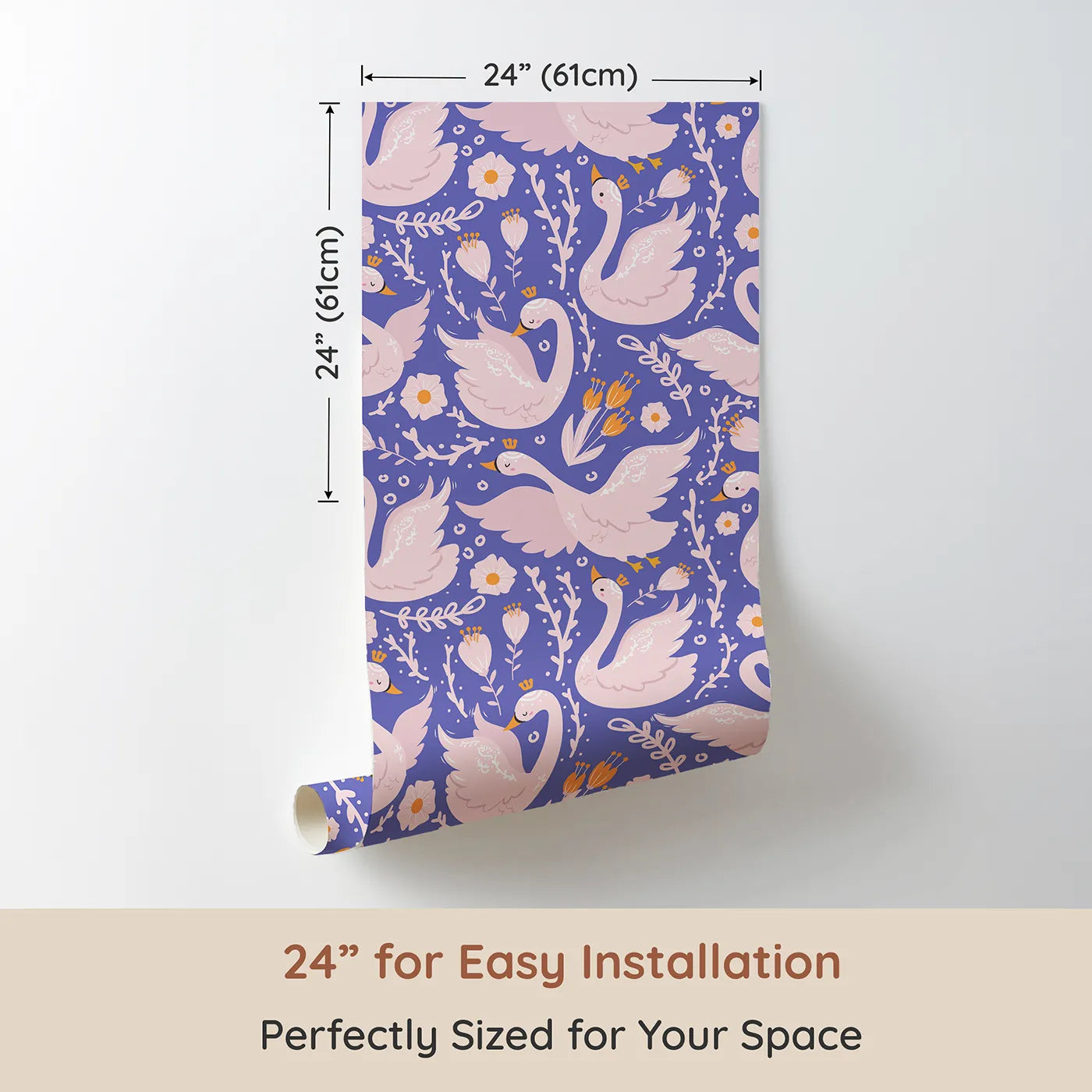 This whimsical girls wallpaper features cute swan princesses swimming gracefully against a dreamy periwinkle purple background. The magical color combination and sweet design create an enchanting world, perfect for a nursery or bedroom that inspires fairy tales.