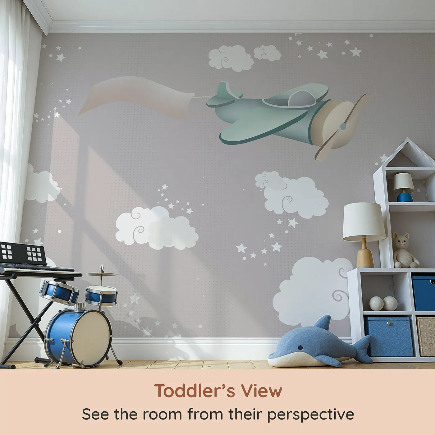 This charming kids wallpaper is perfect for a little aviator's room. A cute, cartoon airplane pulls a blank banner through a starry, neutral-toned sky. The simple, clean design is both modern and whimsical, leaving room for their own big dreams.