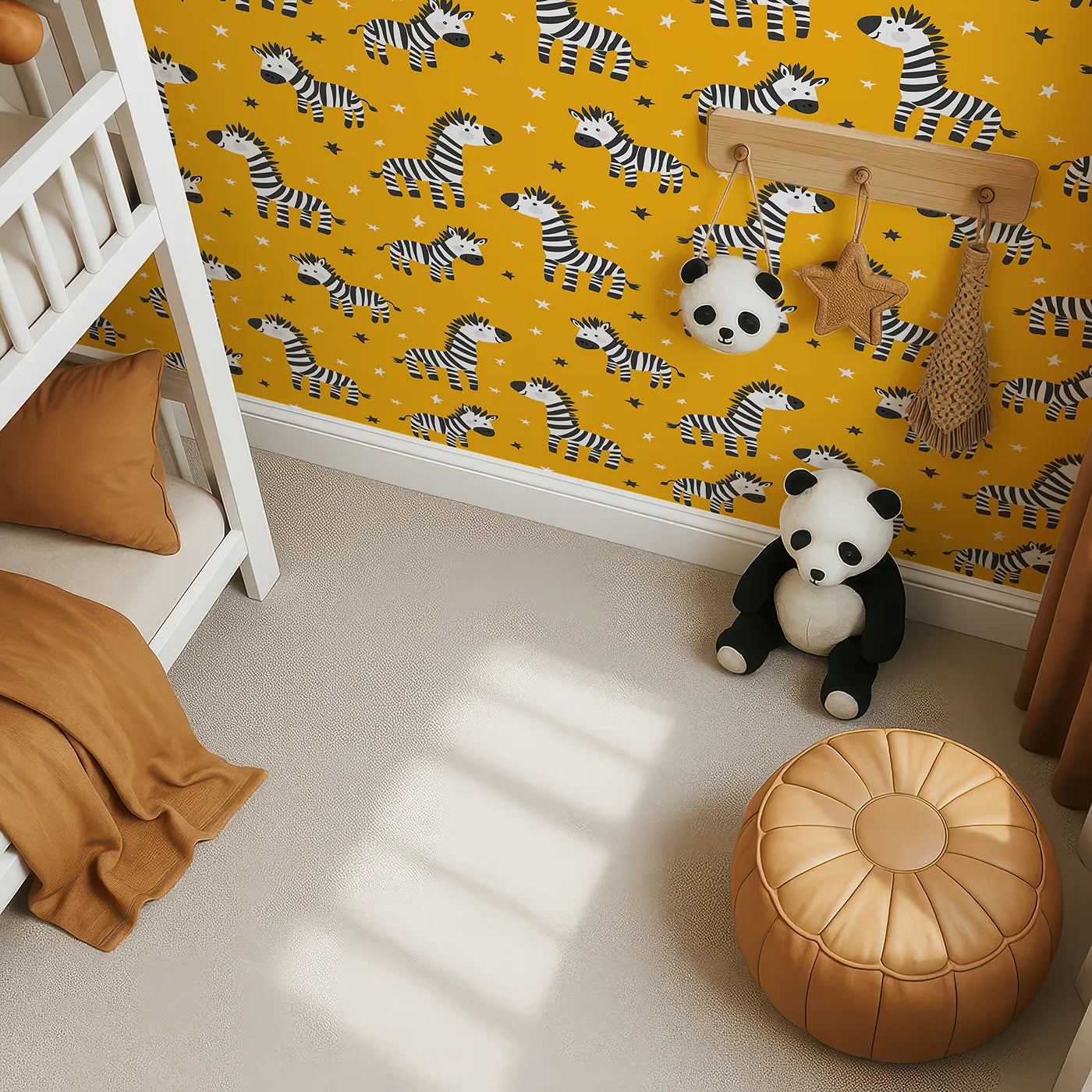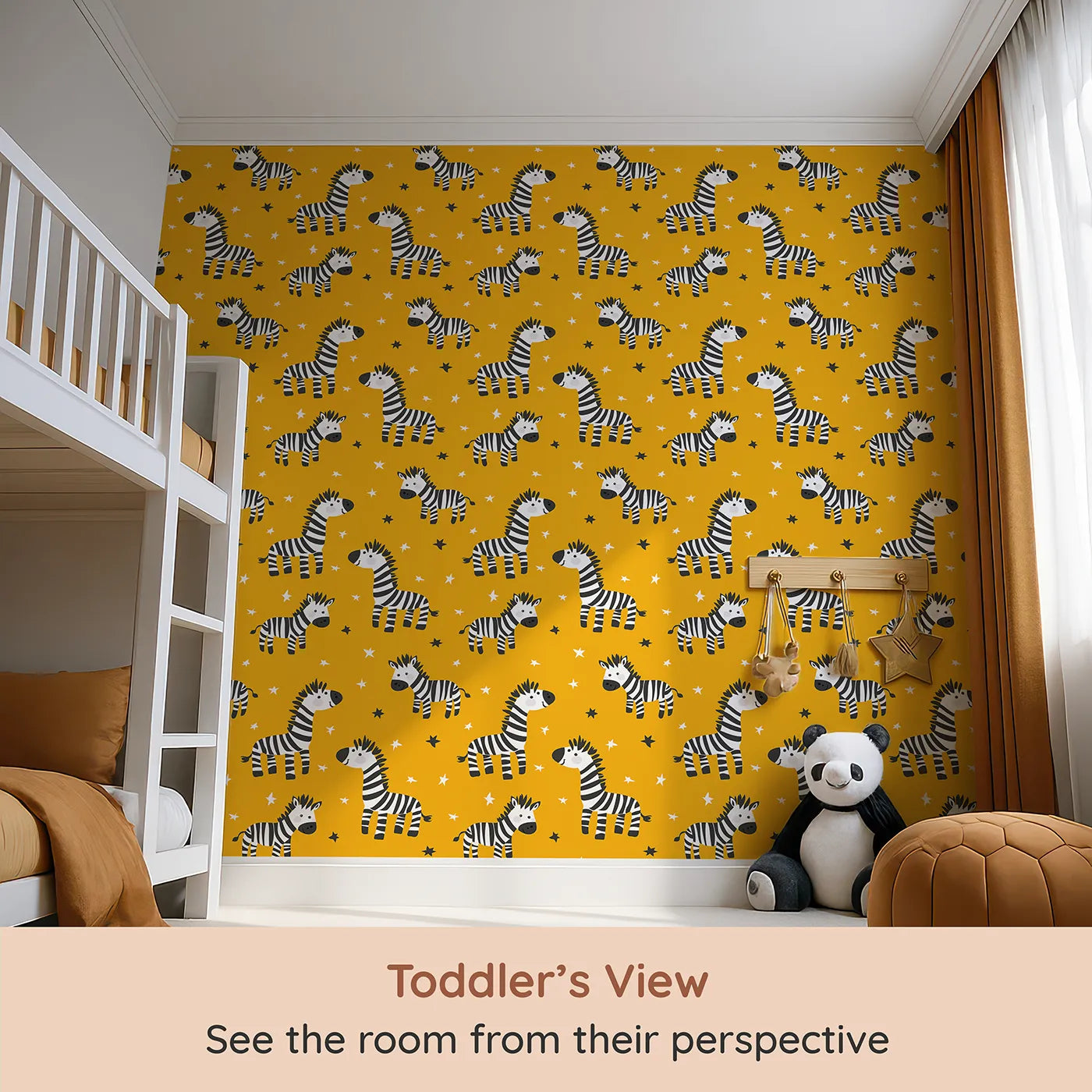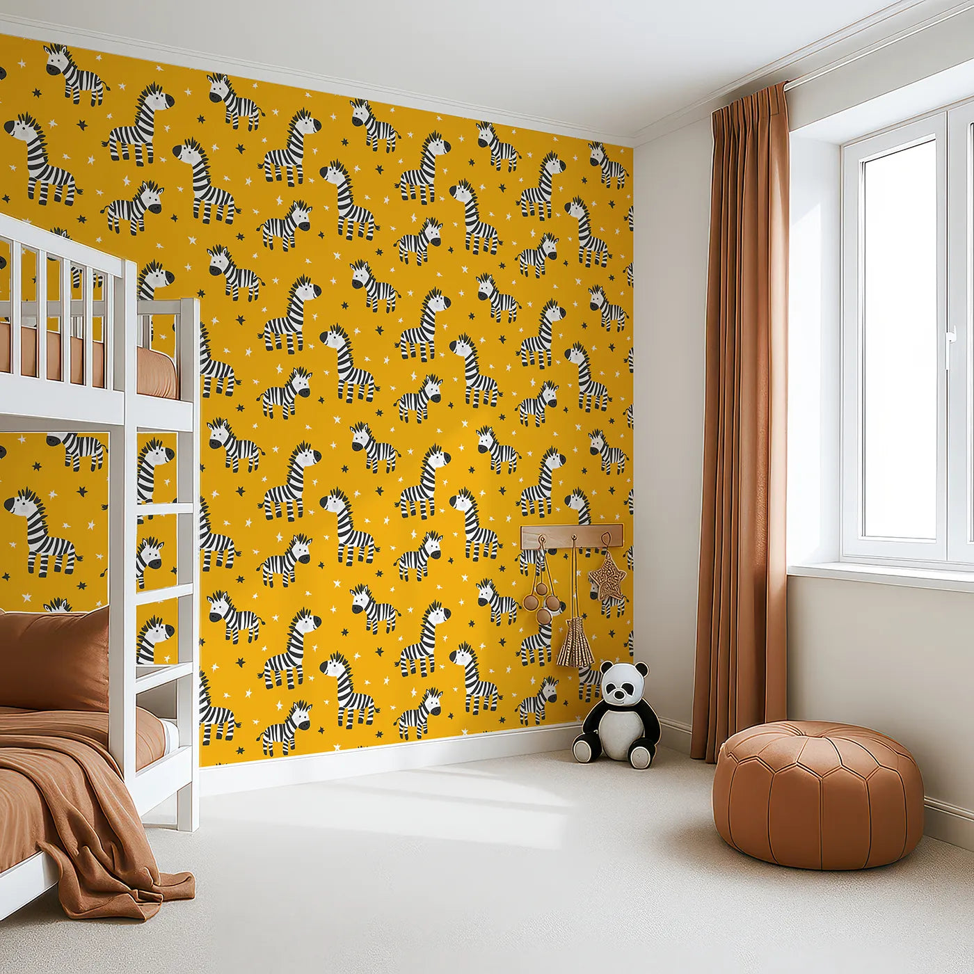 This fun and energetic animal wallpaper is perfect for a little one with a big personality! A bold pattern of happy zebras gallops across a bright yellow background filled with black and white stars. The graphic, playful style creates a vibrant and imaginative atmosphere perfect for a playroom or a bold kids' bedroom.