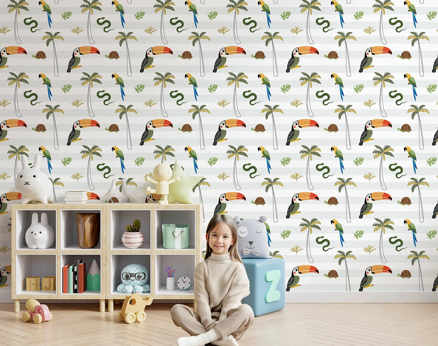This modern jungle wallpaper brings a touch of tropical fun with a clean, contemporary twist. Colorful parrots and slithery green snakes are set against a background of soft gray and white stripes with stylized palm trees. The simple, graphic style is perfect for a stylish, adventurous kids' room.