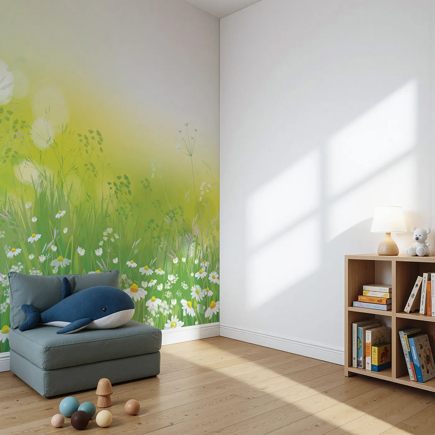 This beautiful floral wall mural captures the dreamy feeling of a summer meadow. A field of delicate daisies and other wildflowers sways in a gentle breeze under a warm, sunny sky. The soft, painterly style brings a calming and joyful touch of nature to any nursery or child's room.