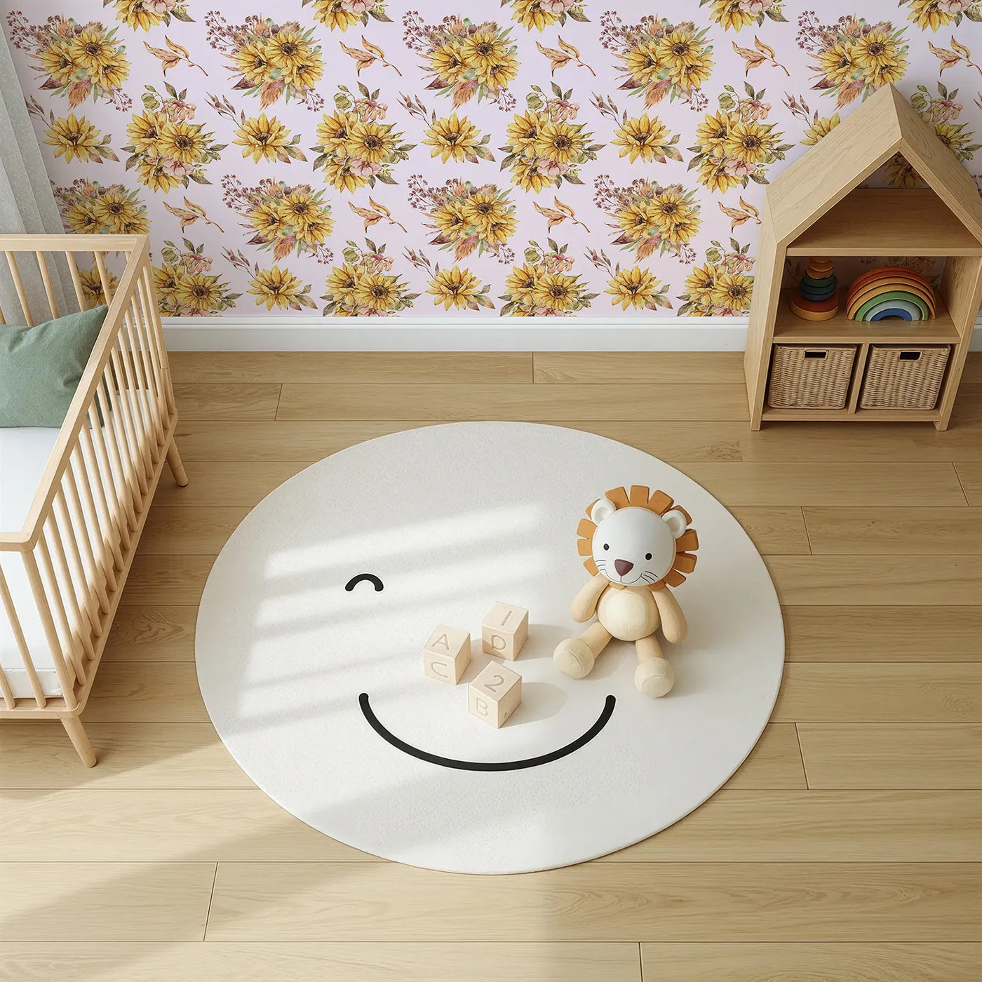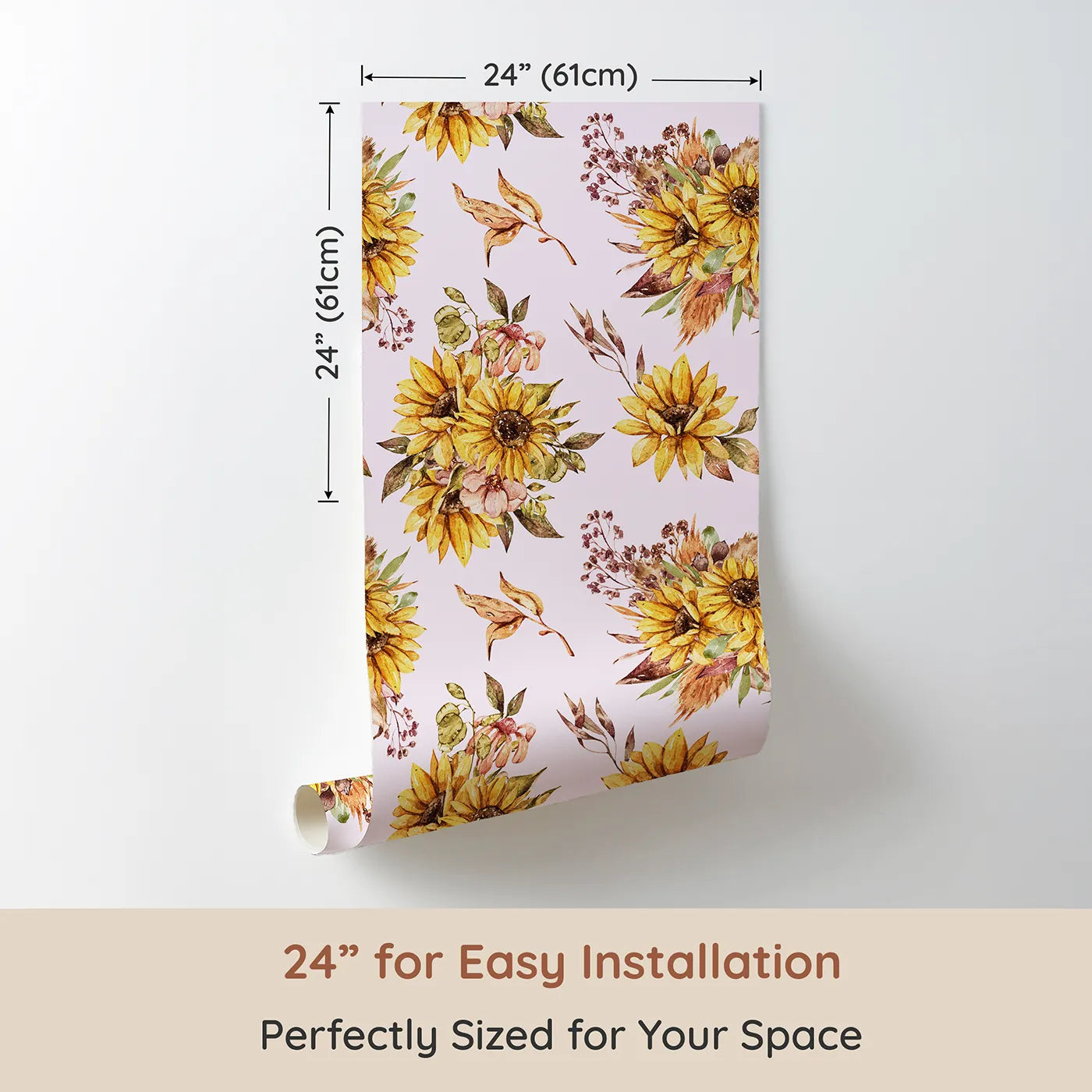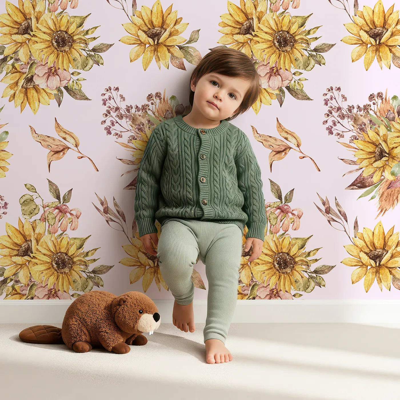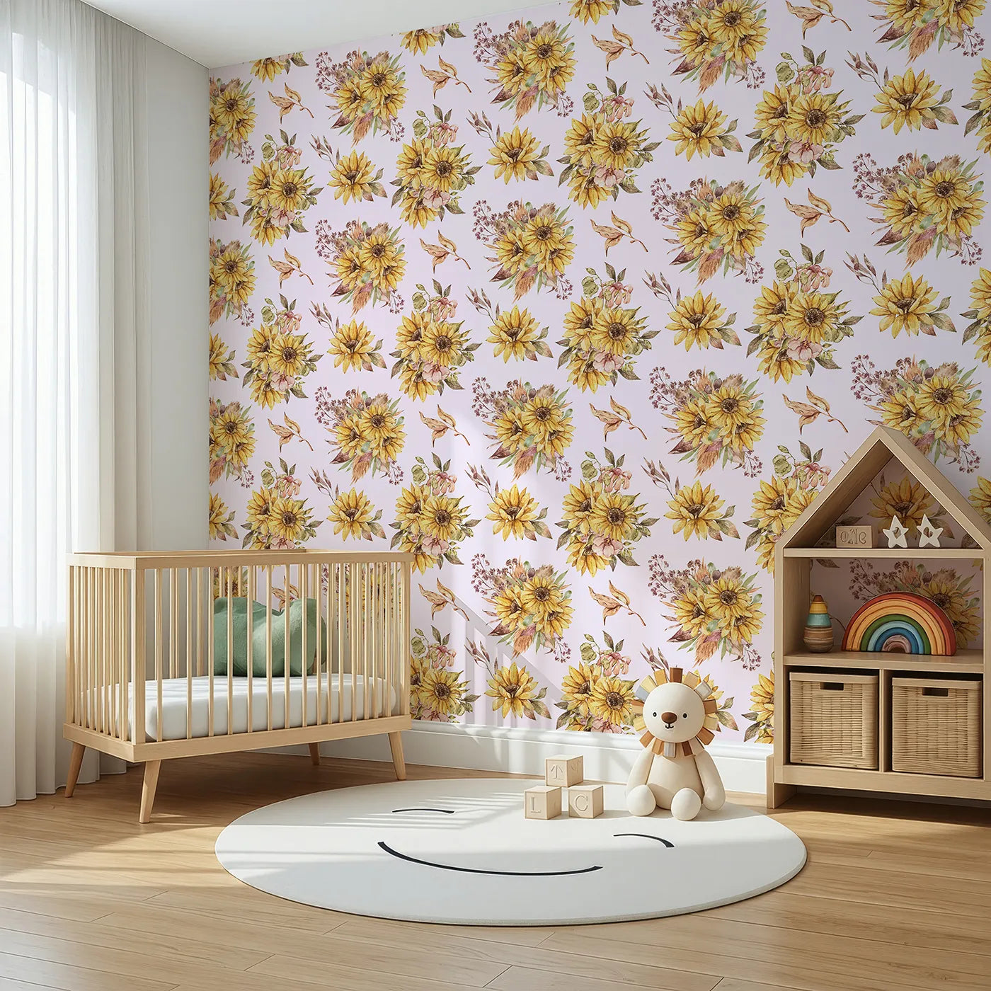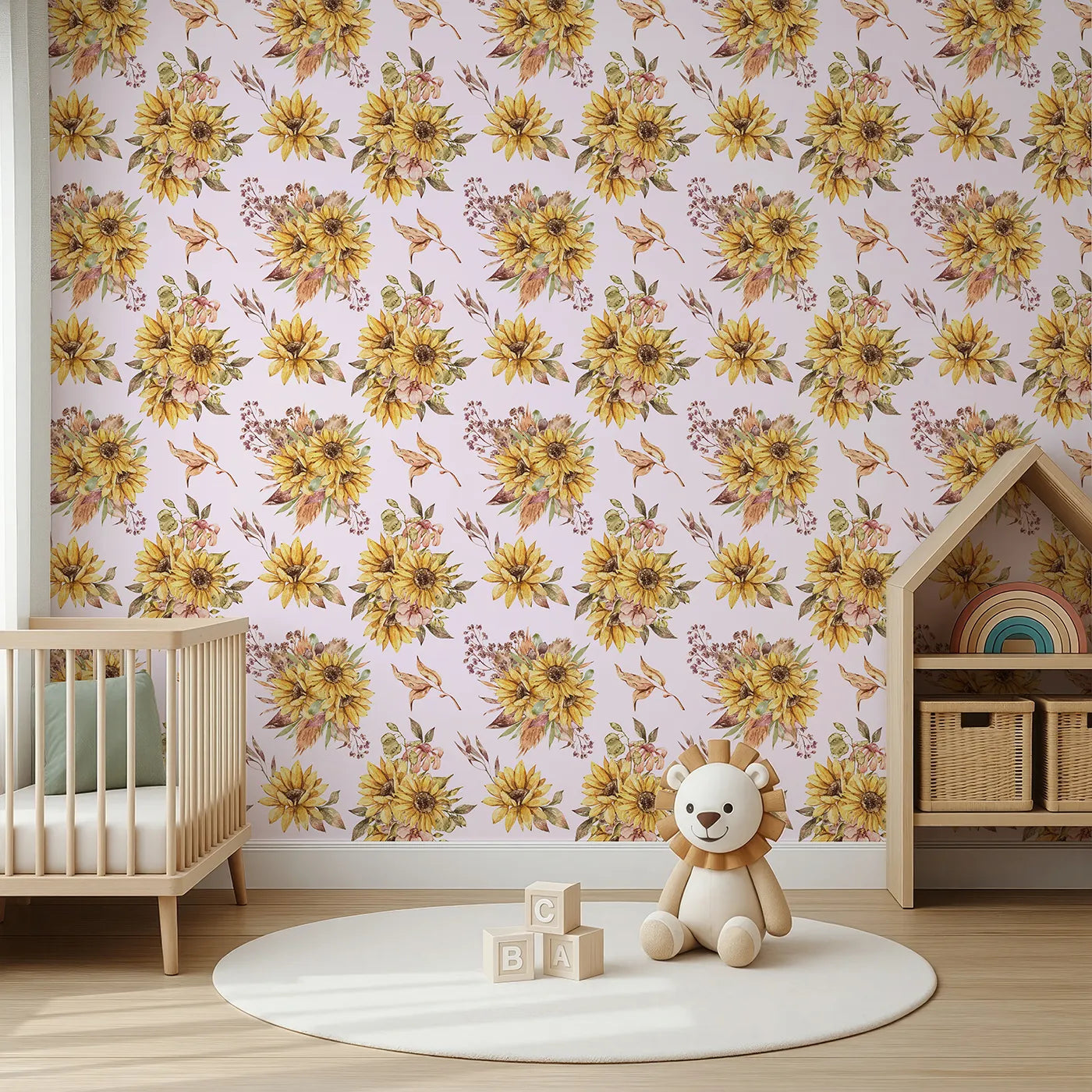 This charming floral wallpaper fills the room with the cheerful energy of a sun-kissed meadow on a soft pink background. Featuring beautiful bouquets of watercolor sunflowers and delicate botanicals, it creates a cozy and inviting atmosphere. It’s a perfect design for a bright and happy nursery.